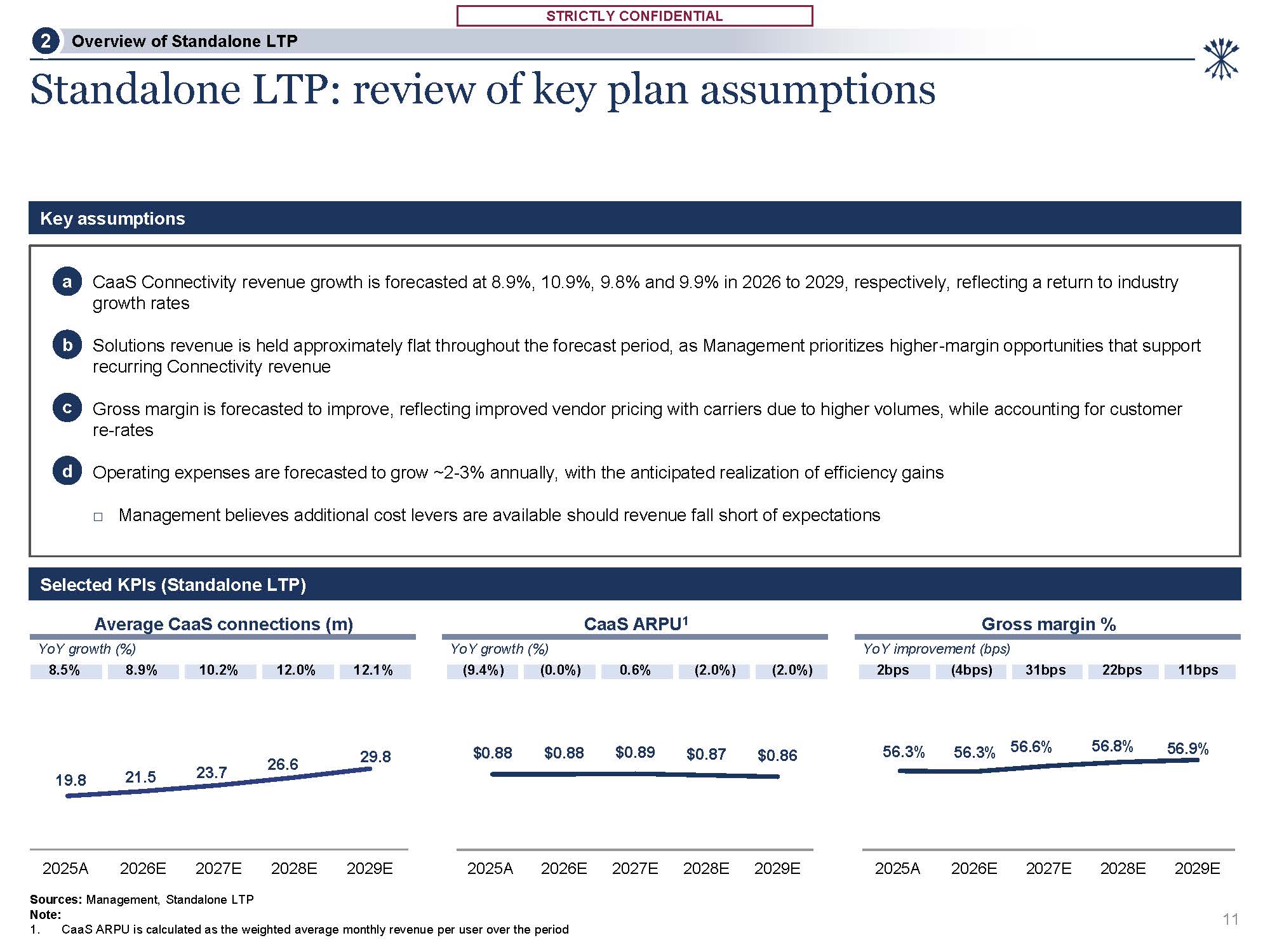 STRICTLY CONFIDENTIAL  STRICTLY CONFIDENTIAL  8.5%  8.9%  10.2%  12.0%  12.1%  19.8  21.5  23.7  26.6  29.8  2025A 2026E 2027E 2028E  Sources: Management, Standalone LTP  Note:  2029E  2bps  (4bps)  31bps  22bps  11bps  56.3%  56.3% 56.6%  56.8%  56.9%  2025A  2026E  2027E  2028E  2029E  (9.4%)  (0.0%)  0.6%  (2.0%)  (2.0%)  $0.88  $0.88  $0.89  $0.87  $0.86  2025A  2026E  2027E  2028E  2029E  Standalone LTP: review of key plan assumptions  1. CaaS ARPU is calculated as the weighted average monthly revenue per user over the period  Selected KPIs (Standalone LTP)  Key assumptions  a CaaS Connectivity revenue growth is forecasted at 8.9%, 10.9%, 9.8% and 9.9% in 2026 to 2029, respectively, reflecting a return to industry growth rates  b Solutions revenue is held approximately flat throughout the forecast period, as Management prioritizes higher-margin opportunities that support recurring Connectivity revenue  c Gross margin is forecasted to improve, reflecting improved vendor pricing with carriers due to higher volumes, while accounting for customer re-rates  d Operating expenses are forecasted to grow ~2-3% annually, with the anticipated realization of efficiency gains  Management believes additional cost levers are available should revenue fall short of expectations  Average CaaS connections (m) CaaS ARPU1 Gross margin %  YoY growth (%) YoY growth (%) YoY improvement (bps)  Overview of Standalone LTP  2  11