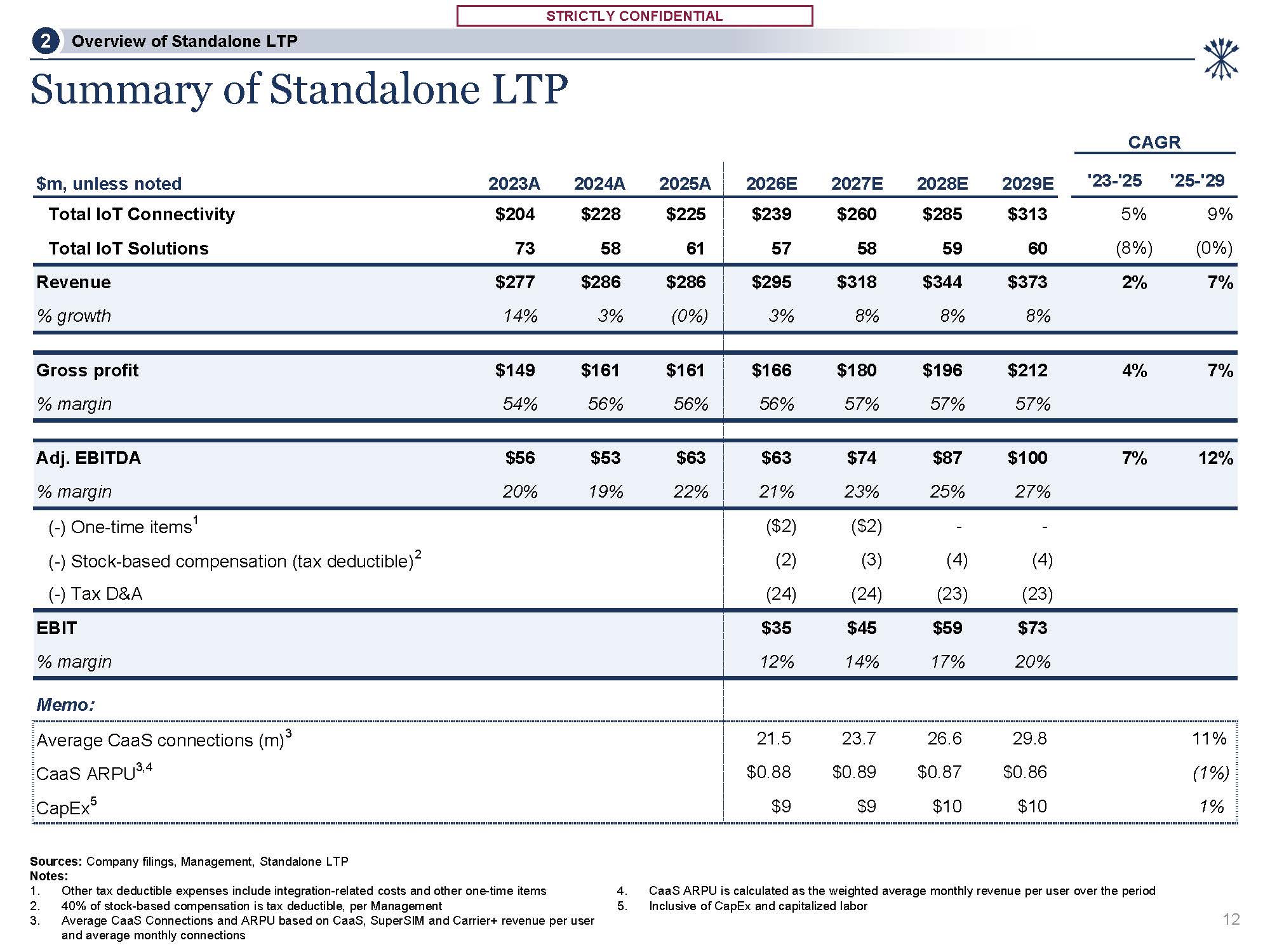 STRICTLY CONFIDENTIAL  STRICTLY CONFIDENTIAL   CAGR   $m, unless noted 2023A 2024A 2025A  2026E 2027E 2028E 2029E  '23-'25 '25-'29  Total IoT Connectivity $204 $228 $225  Total IoT Solutions 73 58 61  $239 $260 $285 $313  57 58 59 60  5% 9%  (8%) (0%)  Revenue $277 $286 $286  % growth 14% 3% (0%)  $295 $318 $344 $373 2% 7%  3% 8% 8% 8%  Gross profit $149 $161 $161  % margin 54% 56% 56%  $166 $180 $196 $212 4% 7%  56% 57% 57% 57%  Adj. EBITDA $56 $53 $63  % margin 20% 19% 22%  $63 $74 $87 $100 7% 12%  21% 23% 25% 27%  (-) One-time items1  (-) Stock-based compensation (tax deductible)2 (-) Tax D&A  ($2) ($2) - -  (2) (3) (4) (4)  (24) (24) (23) (23)  EBIT  % margin  $35 $45 $59 $73  12% 14% 17% 20%  Memo:  Average CaaS connections (m)3  CaaS ARPU3,4  CapEx5  21.5 23.7 26.6 29.8 11%  $0.88 $0.89 $0.87 $0.86 (1%)  $9 $9 $10 $10 1%  Summary of Standalone LTP  Sources: Company filings, Management, Standalone LTP  Notes:  Other tax deductible expenses include integration-related costs and other one-time items  40% of stock-based compensation is tax deductible, per Management  Average CaaS Connections and ARPU based on CaaS, SuperSIM and Carrier+ revenue per user and average monthly connections  CaaS ARPU is calculated as the weighted average monthly revenue per user over the period  Inclusive of CapEx and capitalized labor  12  Overview of Standalone LTP  2