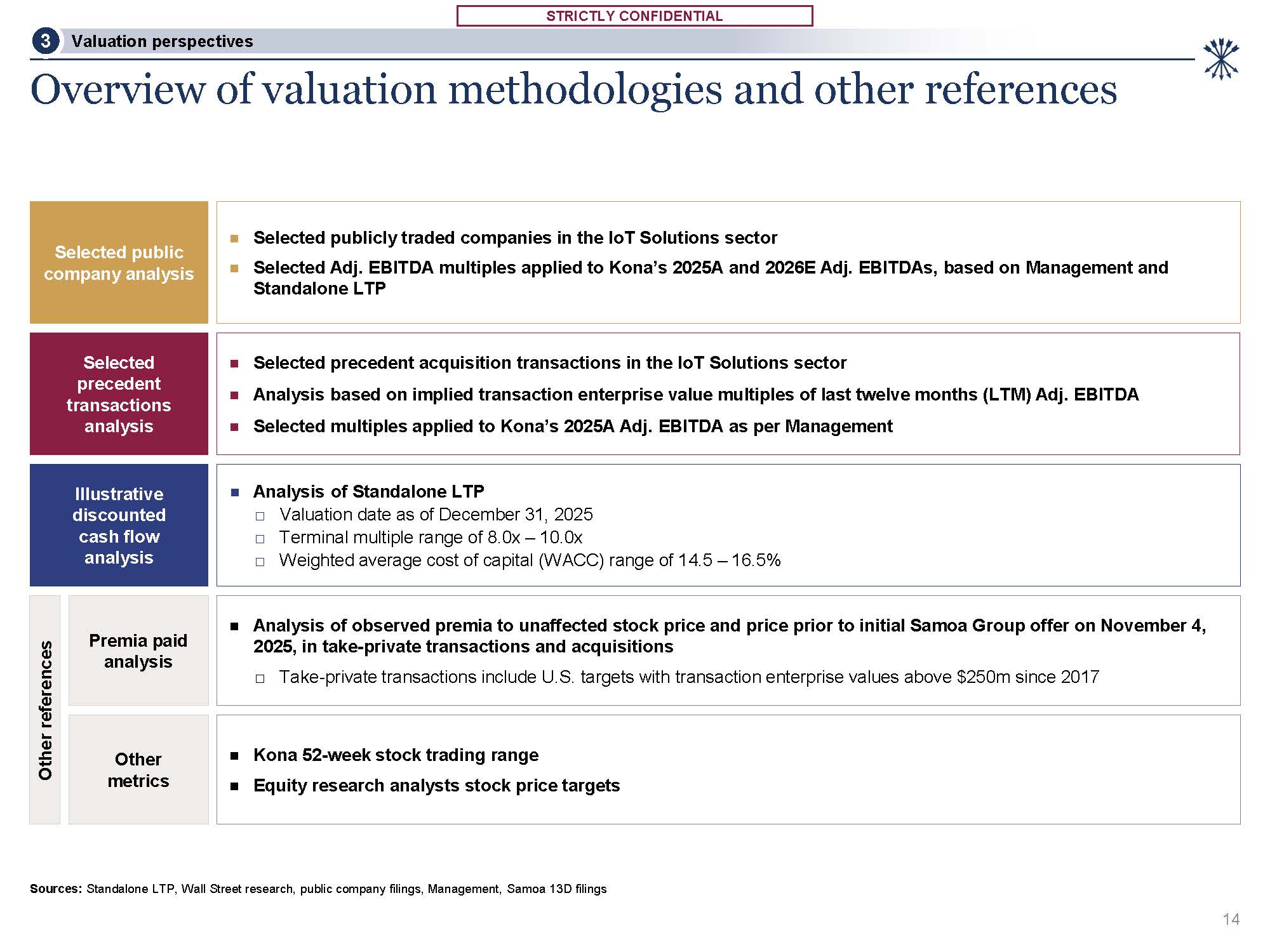 STRICTLY CONFIDENTIAL  STRICTLY CONFIDENTIAL  Overview of valuation methodologies and other references  Selected public company analysis  Selected publicly traded companies in the IoT Solutions sector  Selected Adj. EBITDA multiples applied to Kona’s 2025A and 2026E Adj. EBITDAs, based on Management and  Standalone LTP  Selected precedent acquisition transactions in the IoT Solutions sector  Analysis based on implied transaction enterprise value multiples of last twelve months (LTM) Adj. EBITDA  Selected multiples applied to Kona’s 2025A Adj. EBITDA as per Management  Selected precedent transactions analysis  Analysis of Standalone LTP  Valuation date as of December 31, 2025  Terminal multiple range of 8.0x – 10.0x  Weighted average cost of capital (WACC) range of 14.5 – 16.5%  Illustrative discounted cash flow analysis  Other references  Premia paid  analysis  Analysis of observed premia to unaffected stock price and price prior to initial Samoa Group offer on November 4, 2025, in take-private transactions and acquisitions  □ Take-private transactions include U.S. targets with transaction enterprise values above $250m since 2017  Other metrics  Kona 52-week stock trading range  Equity research analysts stock price targets  14  Sources: Standalone LTP, Wall Street research, public company filings, Management, Samoa 13D filings  Valuation perspectives  3