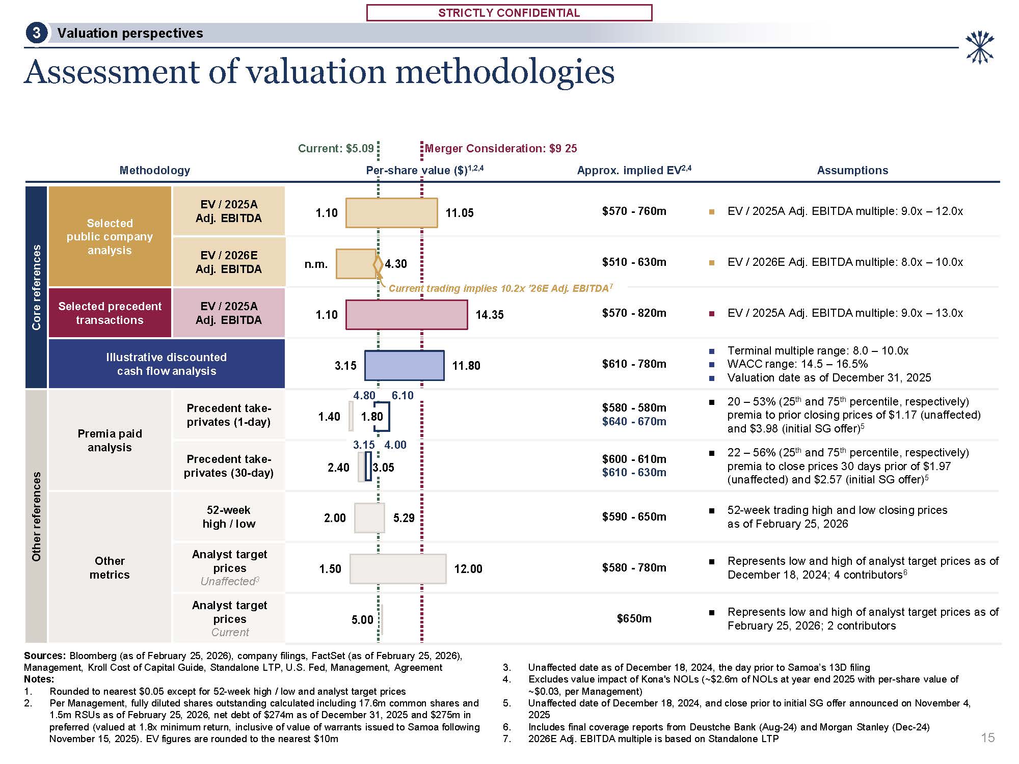 STRICTLY CONFIDENTIAL  STRICTLY CONFIDENTIAL  Methodology  Current: $5.09 Merger Consideration: $9.25  Per-share value ($)1,2,4 Approx. implied EV2,4  Assumptions  Core references  Selected public company  analysis  EV / 2025A Adj. EBITDA  $570 - 760m  EV / 2025A Adj. EBITDA multiple: 9.0x – 12.0x  EV / 2026E Adj. EBITDA  $510 - 630m  EV / 2026E Adj. EBITDA multiple: 8.0x – 10.0x  Selected precedent transactions  EV / 2025A Adj. EBITDA  Illustrative discounted cash flow analysis  Other references  Premia paid analysis  Precedent take-  privates (1-day)  $580 - 580m  $640 - 670m  20 – 53% (25th and 75th percentile, respectively) premia to prior closing prices of $1.17 (unaffected) and $3.98 (initial SG offer)5  Precedent take-privates (30-day)  $600 - 610m  $610 - 630m  22 – 56% (25th and 75th percentile, respectively) premia to close prices 30 days prior of $1.97 (unaffected) and $2.57 (initial SG offer)5  Other metrics  52-week high / low  $590 - 650m  52-week trading high and low closing prices as of February 25, 2026  Analyst target prices Unaffected3  $580 - 780m  Represents low and high of analyst target prices as of December 18, 2024; 4 contributors6  Analyst target prices Current  $650m  Represents low and high of analyst target prices as of February 25, 2026; 2 contributors  1.10  n.m.  2.00  1.50  5.00  11.05  4.30  1.10  14.35  $570 - 820m  EV / 2025A Adj. EBITDA multiple: 9.0x – 13.0x  Terminal multiple range: 8.0 – 10.0x  3.15  11.80  $610 - 780m  WACC range: 14.5 – 16.5%  Valuation date as of December 31, 2025  1.40 1.80  2.40 3.05  5.29  12.00  Assessment of valuation methodologies  Sources: Bloomberg (as of February 25, 2026), company filings, FactSet (as of February 25, 2026), Management, Kroll Cost of Capital Guide, Standalone LTP, U.S. Fed, Management, Agreement Notes:  Rounded to nearest $0.05 except for 52-week high / low and analyst target prices  Per Management, fully diluted shares outstanding calculated including 17.6m common shares and  1.5m RSUs as of February 25, 2026, net debt of $274m as of December 31, 2025 and $275m in preferred (valued at 1.8x minimum return, inclusive of value of warrants issued to Samoa following November 15, 2025). EV figures are rounded to the nearest $10m  Unaffected date as of December 18, 2024, the day prior to Samoa’s 13D filing  Excludes value impact of Kona's NOLs (~$2.6m of NOLs at year end 2025 with per-share value of  ~$0.03, per Management)  Unaffected date of December 18, 2024, and close prior to initial SG offer announced on November 4,  2025  Includes final coverage reports from Deustche Bank (Aug-24) and Morgan Stanley (Dec-24)  2026E Adj. EBITDA multiple is based on Standalone LTP  15  4.80 6.10  3.15 4.00  Current trading implies 10.2x ’26E Adj. EBITDA7     Valuation perspectives  3