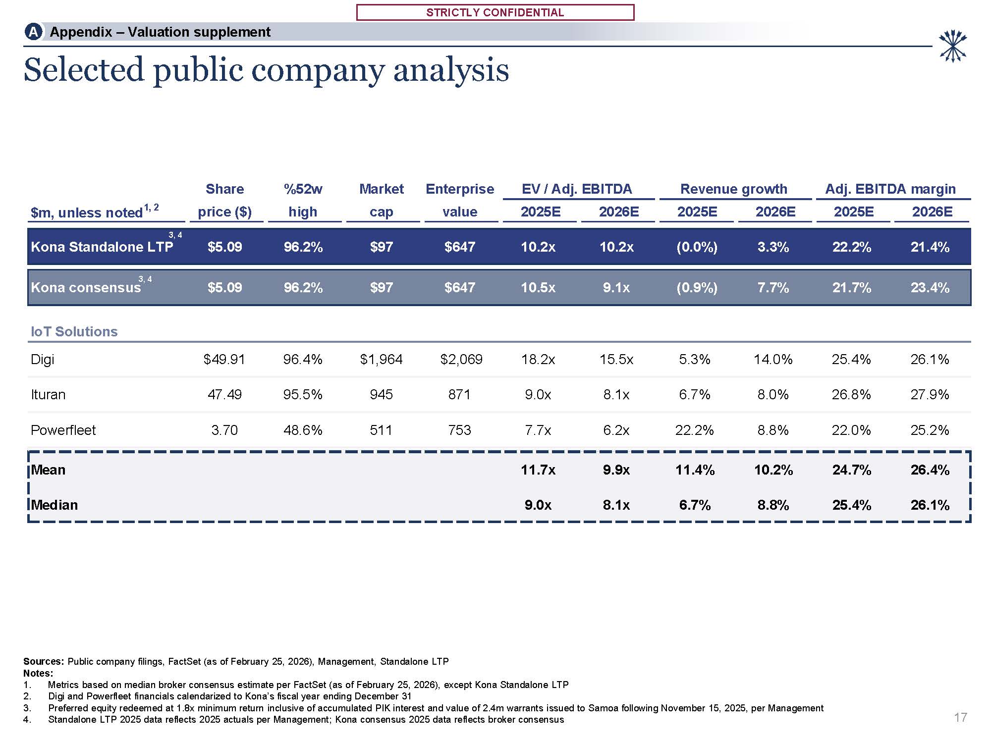 STRICTLY CONFIDENTIAL  STRICTLY CONFIDENTIAL  3, 4  Kona Standalone LTP  $5.09  96.2%  $97  $647  10.2x  10.2x  (0.0%)  3.3%  22.2%  21.4%  3, 4  Kona consensus  $5.09  96.2%  $97  $647  10.5x  9.1x  (0.9%)  7.7%  21.7%  23.4%  IoT Solutions  Digi  $49.91  96.4%  $1,964  $2,069  18.2x  15.5x  5.3%  14.0%  25.4%  26.1%  Ituran  47.49  95.5%  945  871  9.0x  8.1x  6.7%  8.0%  26.8%  27.9%  Powerfleet  3.70  48.6%  511  753  7.7x  6.2x  22.2%  8.8%  22.0%  25.2%  Mean  11.7x  9.9x  11.4%  10.2%  24.7%  26.4%  Median  9.0x  8.1x  6.7%  8.8%  25.4%  26.1%  Share  %52w  Market  Enterprise  EV / Adj. EBITDA  Revenue growth  Adj. EBITDA margin  $m, unless noted1, 2  price ($)  high  cap  value  2025E 2026E  2025E 2026E  2025E 2026E  Selected public company analysis  Sources: Public company filings, FactSet (as of February 25, 2026), Management, Standalone LTP  Notes:  Metrics based on median broker consensus estimate per FactSet (as of February 25, 2026), except Kona Standalone LTP  Digi and Powerfleet financials calendarized to Kona’s fiscal year ending December 31  Preferred equity redeemed at 1.8x minimum return inclusive of accumulated PIK interest and value of 2.4m warrants issued to Samoa following November 15, 2025, per Management  Standalone LTP 2025 data reflects 2025 actuals per Management; Kona consensus 2025 data reflects broker consensus  17  A Appendix – Valuation supplement