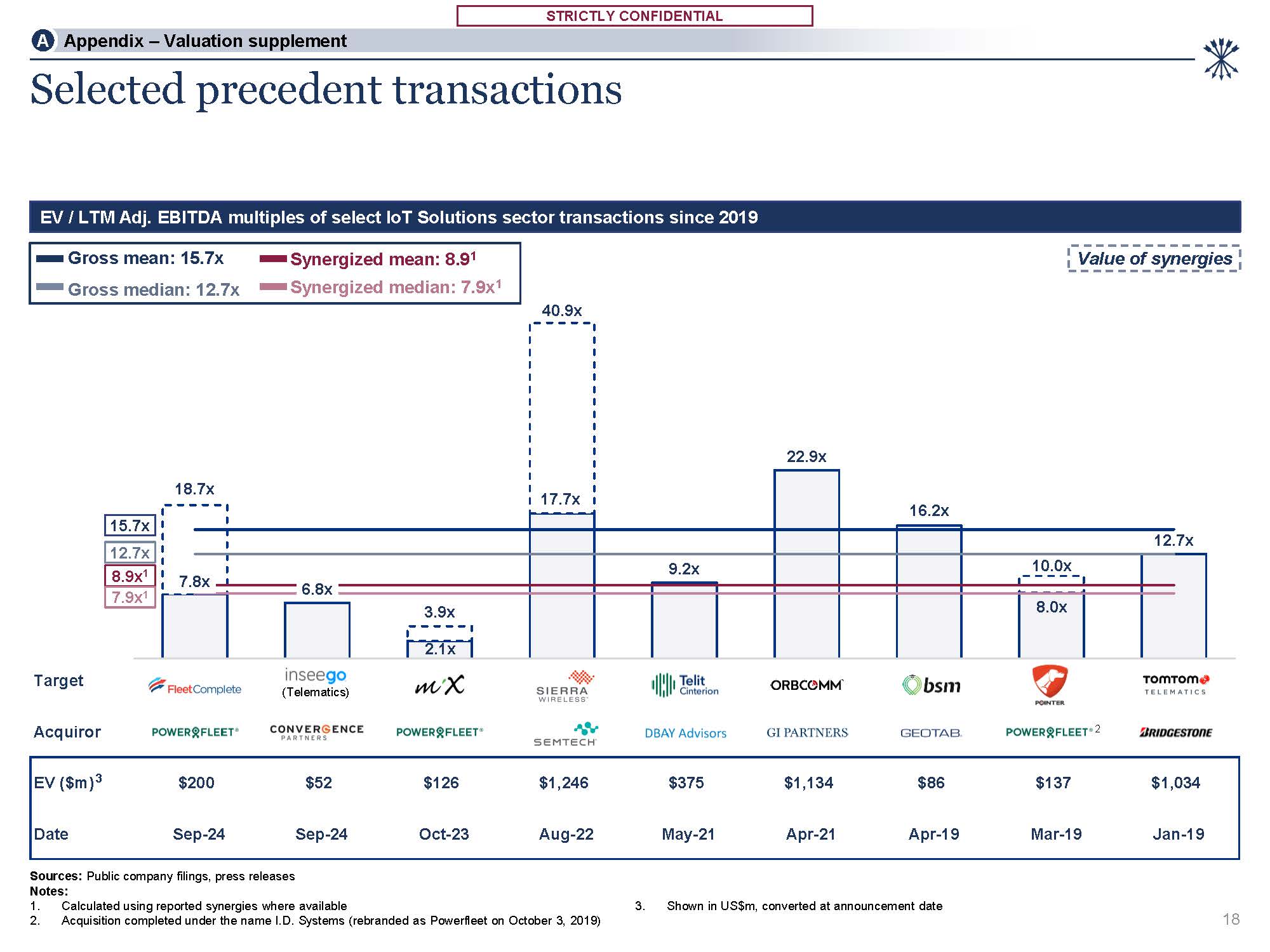 STRICTLY CONFIDENTIAL  STRICTLY CONFIDENTIAL  A Appendix – Valuation supplement  Target  Acquiror  EV ($m)3  $200  $52  $126  $1,246  $375  $1,134  $86  $137  $1,034  Date  Sep-24  Sep-24  Oct-23  Aug-22  May-21  Apr-21  Apr-19  Mar-19  Jan-19  7.8x  2.1x  17.7x  8.0x  18.7x  6.8x  3.9x  40.9x  9.2x  22.9x  16.2x  10.0x  12.7x  Selected precedent transactions  Sources: Public company filings, press releases  Notes:  Calculated using reported synergies where available  Acquisition completed under the name I.D. Systems (rebranded as Powerfleet on October 3, 2019)  3. Shown in US$m, converted at announcement date  EV / LTM Adj. EBITDA multiples of select IoT Solutions sector transactions since 2019  (Telematics)  2  Value of synergies  15.7x  12.7x  8.9x1  7.9x1  Gross mean: 15.7x Gross median: 12.7x  Synergized mean: 8.91 Synergized median: 7.9x1  18