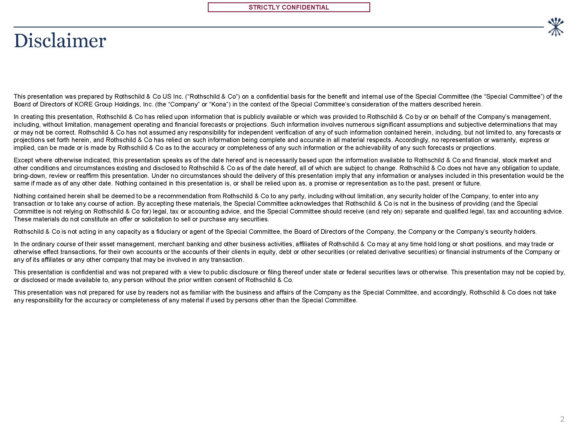 STRICTLY CONFIDENTIAL  Disclaimer  1. Section name  This presentation was prepared by Rothschild & Co US Inc. (“Rothschild & Co”) on a confidential basis for the benefit and internal use of the Special Committee (the “Special Committee”) of the Board of Directors of KORE Group Holdings, Inc. (the “Company” or “Kona”) in the context of the Special Committee’s consideration of the matters described herein.  In creating this presentation, Rothschild & Co has relied upon information that is publicly available or which was provided to Rothschild & Co by or on behalf of the Company’s management, including, without limitation, management operating and financial forecasts or projections. Such information involves numerous significant assumptions and subjective determinations that may or may not be correct. Rothschild & Co has not assumed any responsibility for independent verification of any of such information contained herein, including, but not limited to, any forecasts or projections set forth herein, and Rothschild & Co has relied on such information being complete and accurate in all material respects. Accordingly, no representation or warranty, express or implied, can be made or is made by Rothschild & Co as to the accuracy or completeness of any such information or the achievability of any such forecasts or projections.  Except where otherwise indicated, this presentation speaks as of the date hereof and is necessarily based upon the information available to Rothschild & Co and financial, stock market and other conditions and circumstances existing and disclosed to Rothschild & Co as of the date hereof, all of which are subject to change. Rothschild & Co does not have any obligation to update, bring-down, review or reaffirm this presentation. Under no circumstances should the delivery of this presentation imply that any information or analyses included in this presentation would be the same if made as of any other date. Nothing contained in this presentation is, or shall be relied upon as, a promise or representation as to the past, present or future.  Nothing contained herein shall be deemed to be a recommendation from Rothschild & Co to any party, including without limitation, any security holder of the Company, to enter into any transaction or to take any course of action. By accepting these materials, the Special Committee acknowledges that Rothschild & Co is not in the business of providing (and the Special Committee is not relying on Rothschild & Co for) legal, tax or accounting advice, and the Special Committee should receive (and rely on) separate and qualified legal, tax and accounting advice. These materials do not constitute an offer or solicitation to sell or purchase any securities.  Rothschild & Co is not acting in any capacity as a fiduciary or agent of the Special Committee, the Board of Directors of the Company, the Company or the Company’s security holders.  In the ordinary course of their asset management, merchant banking and other business activities, affiliates of Rothschild & Co may at any time hold long or short positions, and may trade or otherwise effect transactions, for their own accounts or the accounts of their clients in equity, debt or other securities (or related derivative securities) or financial instruments of the Company or any of its affiliates or any other company that may be involved in any transaction.  This presentation is confidential and was not prepared with a view to public disclosure or filing thereof under state or federal securities laws or otherwise. This presentation may not be copied by,  or disclosed or made available to, any person without the prior written consent of Rothschild & Co.  This presentation was not prepared for use by readers not as familiar with the business and affairs of the Company as the Special Committee, and accordingly, Rothschild & Co does not take any responsibility for the accuracy or completeness of any material if used by persons other than the Special Committee.  2