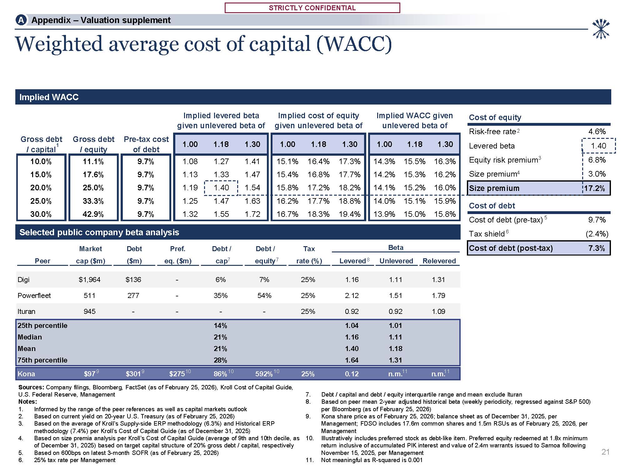 STRICTLY CONFIDENTIAL  STRICTLY CONFIDENTIAL  Implied levered beta given unlevered beta of  Implied cost of equity given unlevered beta of  Implied WACC given unlevered beta of  Selected public company beta analysis  Tax shield 6 (2.4%)  Market  Debt  Pref.  Debt /  Debt /  Tax   Beta   Cost of debt (post-tax) 7.3%  Peer cap ($m)  ($m)  eq. ($m)  cap7  equity7  rate (%)  Levered8 Unlevered Relevered  Digi $1,964  $136  -  6%  7%  25%  1.16 1.11 1.31  Powerfleet 511  277  -  35%  54%  25%  2.12 1.51 1.79  Ituran  945  -  -  -  -  25%  0.92  0.92  1.09  25th percentile  14%  1.04  1.01  Median  21%  1.16  1.11  Mean  21%  1.40  1.18  75th percentile  28%  1.64  1.31  Kona  $97 9  $3019  $27510  86%10  592%10  25%  0.12  n.m.11  n.m.11  Cost of equity  21  Weighted average cost of capital (WACC)  Sources: Company filings, Bloomberg, FactSet (as of February 25, 2026), Kroll Cost of Capital Guide,  U.S. Federal Reserve, Management  Notes:  Informed by the range of the peer references as well as capital markets outlook  Based on current yield on 20-year U.S. Treasury (as of February 25, 2026)  Based on the average of Kroll’s Supply-side ERP methodology (6.3%) and Historical ERP  methodology (7.4%) per Kroll’s Cost of Capital Guide (as of December 31, 2025)  Based on size premia analysis per Kroll’s Cost of Capital Guide (average of 9th and 10th decile, as  of December 31, 2025) based on target capital structure of 20% gross debt / capital, respectively  Based on 600bps on latest 3-month SOFR (as of February 25, 2026)  25% tax rate per Management  Debt / capital and debt / equity interquartile range and mean exclude Ituran  Based on peer mean 2-year adjusted historical beta (weekly periodicity, regressed against S&P 500) per Bloomberg (as of February 25, 2026)  Kona share price as of February 25, 2026; balance sheet as of December 31, 2025, per Management; FDSO includes 17.6m common shares and 1.5m RSUs as of February 25, 2026, per Management   Illustratively includes preferred stock as debt-like item. Preferred equity redeemed at 1.8x minimum return inclusive of accumulated PIK interest and value of 2.4m warrants issued to Samoa following November 15, 2025, per Management  Not meaningful as R-squared is 0.001  Implied WACC  Gross debt  / capital1  Gross debt  / equity  Pre-tax cost of debt  1.00  1.18  1.30  1.00  1.18  1.30  1.00  1.18  1.30  10.0%  11.1%  9.7%  1.08  1.27  1.41  15.1%  16.4%  17.3%  14.3%  15.5%  16.3%  15.0%  17.6%  9.7%  1.13  1.33  1.47  15.4%  16.8%  17.7%  14.2%  15.3%  16.2%  20.0%  25.0%  9.7%  1.19  1.40  1.54  15.8%  17.2%  18.2%  14.1%  15.2%  16.0%  25.0%  33.3%  9.7%  1.25  1.47  1.63  16.2%  17.7%  18.8%  14.0%  15.1%  15.9%  30.0%  42.9%  9.7%  1.32  1.55  1.72  16.7%  18.3%  19.4%  13.9%  15.0%  15.8%  Risk-free rate 2  4.6%  Levered beta  1.40  Equity risk premium3  6.8%  Size premium4  3.0%  Size premium  17.2%  Cost of debt  Cost of debt (pre-tax) 5  9.7%  A Appendix – Valuation supplement