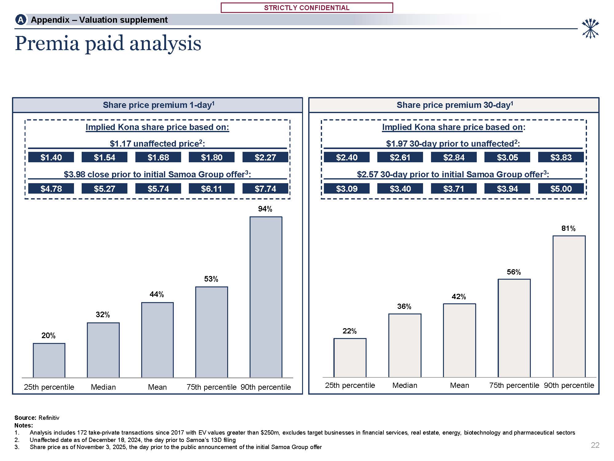 STRICTLY CONFIDENTIAL  STRICTLY CONFIDENTIAL  20%  32%  44%  53%  94%  25th percentile  Median  Mean  75th percentile 90th percentile  22%  36%  42%  56%  81%  25th percentile  Median  Mean  75th percentile 90th percentile  Premia paid analysis  Share price premium 30-day1  Source: Refinitiv  Notes:  Analysis includes 172 take-private transactions since 2017 with EV values greater than $250m, excludes target businesses in financial services, real estate, energy, biotechnology and pharmaceutical sectors  Unaffected date as of December 18, 2024, the day prior to Samoa’s 13D filing  Share price as of November 3, 2025, the day prior to the public announcement of the initial Samoa Group offer  22  A Appendix – Valuation supplement  $2.84  $2.61  $3.05  $3.83  $2.40  $2.57 30-day prior to initial Samoa Group offer3:  $3.09  $3.71  $3.40  $3.94  $5.00  Implied Kona share price based on:  $1.97 30-day prior to unaffected2:  $1.40  $1.68  $1.54  $1.80  $2.27  $4.78  $5.74  $5.27  $6.11  $7.74  Implied Kona share price based on:  $1.17 unaffected price2:  $3.98 close prior to initial Samoa Group offer3:  Share price premium 1-day1