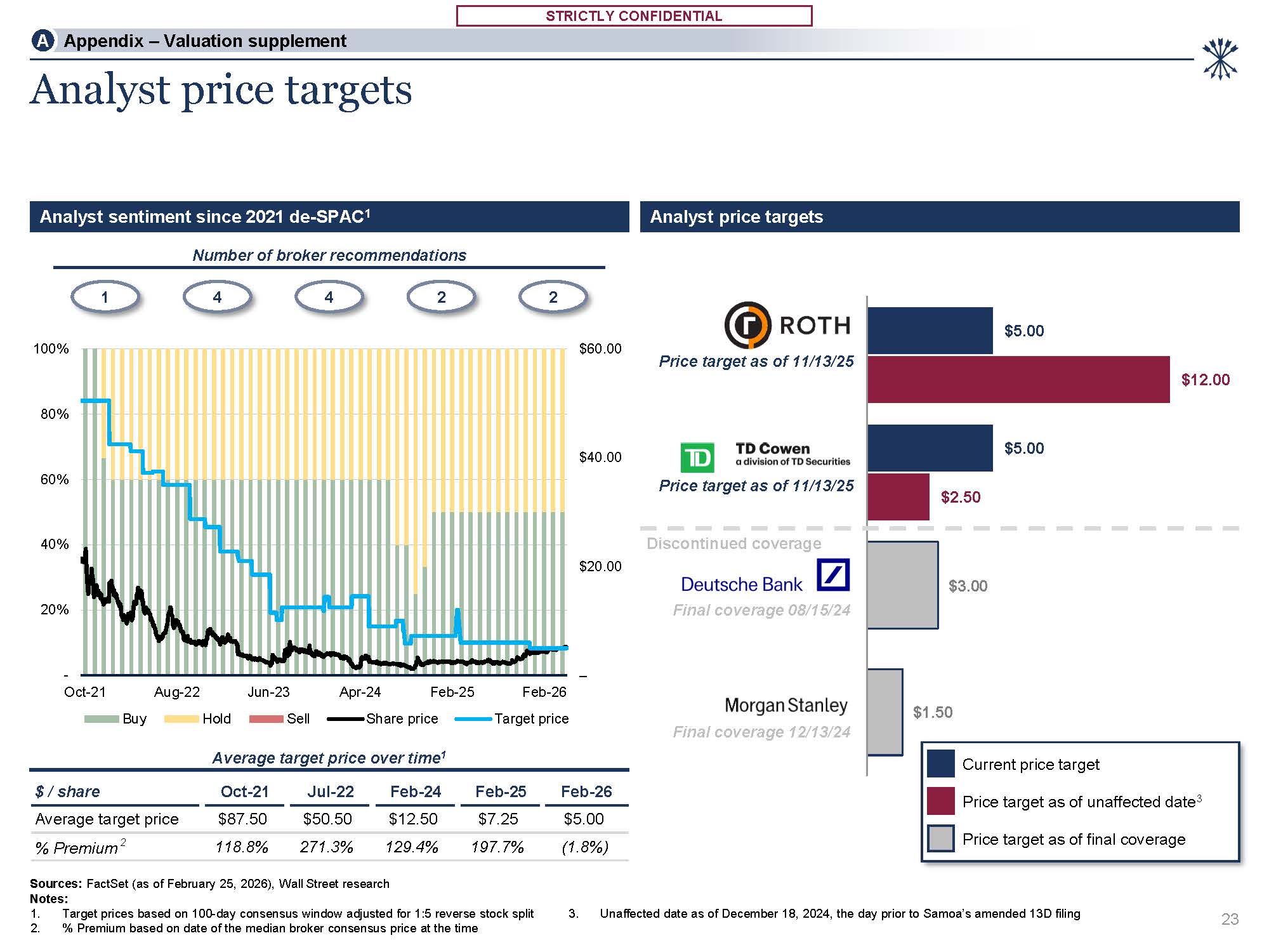 STRICTLY CONFIDENTIAL  STRICTLY CONFIDENTIAL  $ / share  Oct-21  Jul-22  Feb-24  Feb-25  Feb-26  Average target price  $87.50  $50.50  $12.50  $7.25  $5.00  % Premium 2  118.8%  271.3%  129.4%  197.7%  (1.8%)  –  $20.00  $40.00  $60.00  -  20%  40%  60%  80%  100%  Oct-21  Aug-22  Dec-25  Buy  Hold  Jun-23 Apr-24 Feb-25  Sell Share price  Target price  $5.00  $5.00  $12.00  $2.50  $3.00  $1.50  Discontinued coverage  Analyst price targets  Analyst sentiment since 2021 de-SPAC1  Analyst price targets  1  2  Number of broker recommendations  4 4 2  Average target price over time1  Sources: FactSet (as of February 25, 2026), Wall Street research  Notes:  Target prices based on 100-day consensus window adjusted for 1:5 reverse stock split  % Premium based on date of the median broker consensus price at the time  3. Unaffected date as of December 18, 2024, the day prior to Samoa’s amended 13D filing  Price target as of 11/13/25  Price target as of 11/13/25  Final coverage 12/13/24  Final coverage 08/15/24  Current price target  Price target as of unaffected date3 Price target as of final coverage  23  A Appendix – Valuation supplement  Feb-26