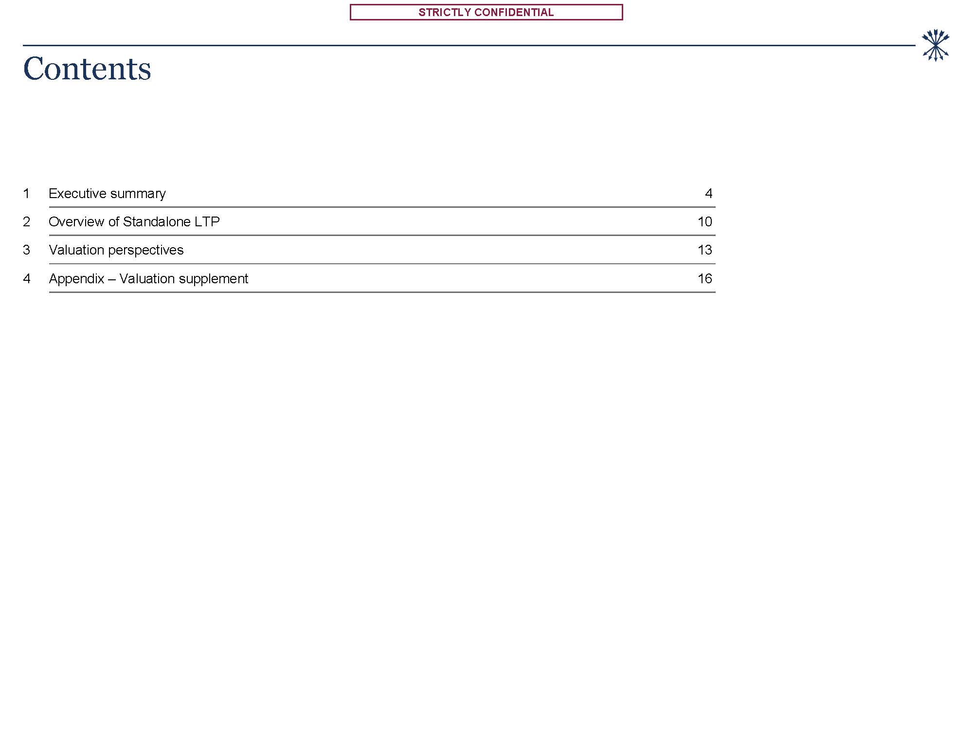 STRICTLY CONFIDENTIAL  Contents  Executive summary  Overview of Standalone LTP  Valuation perspectives  Appendix – Valuation supplement  4  10  13  16