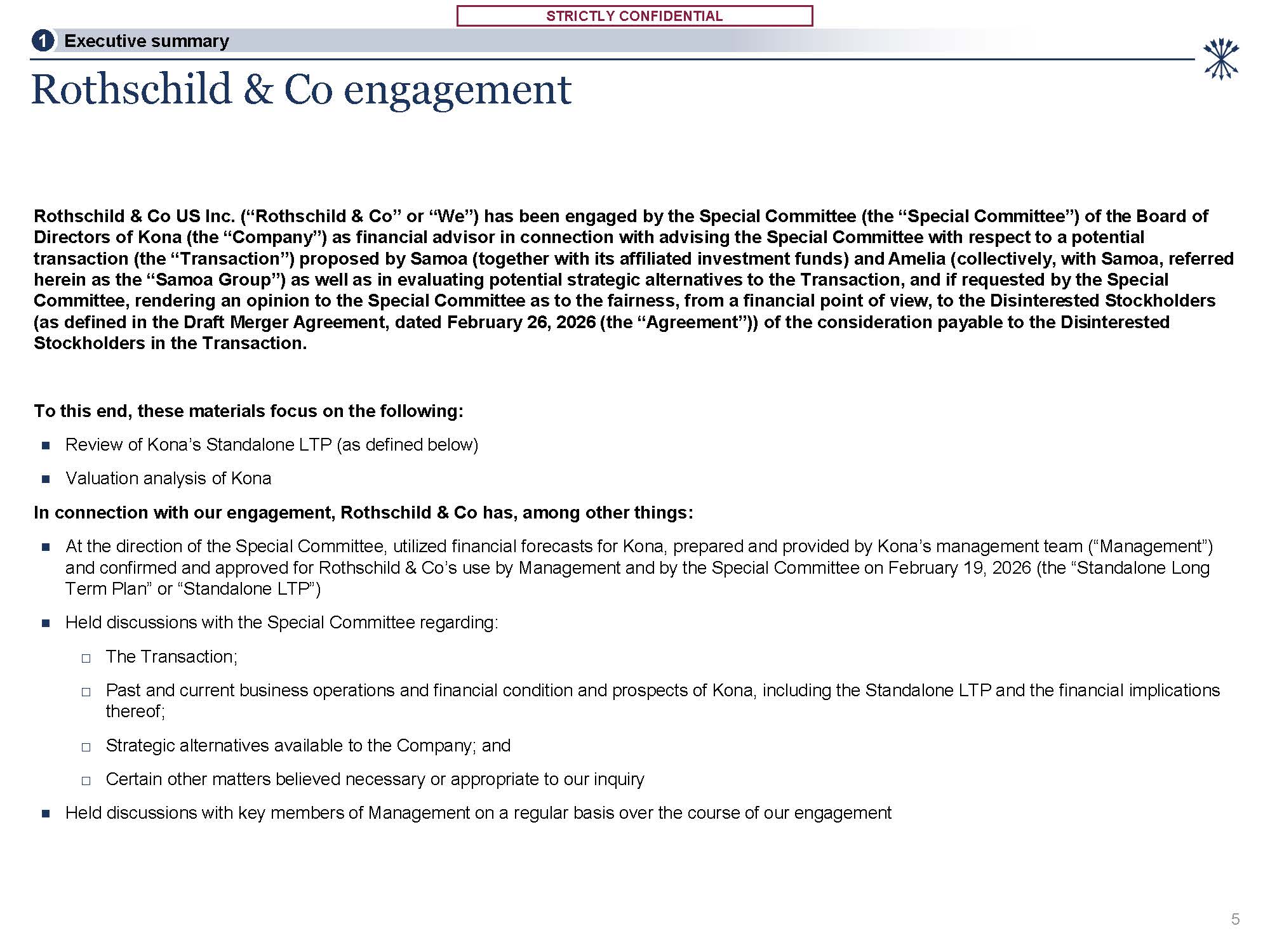 STRICTLY CONFIDENTIAL  Rothschild & Co engagement  5  Rothschild & Co US Inc. (“Rothschild & Co” or “We”) has been engaged by the Special Committee (the “Special Committee”) of the Board of Directors of Kona (the “Company”) as financial advisor in connection with advising the Special Committee with respect to a potential transaction (the “Transaction”) proposed by Samoa (together with its affiliated investment funds) and Amelia (collectively, with Samoa, referred herein as the “Samoa Group”) as well as in evaluating potential strategic alternatives to the Transaction, and if requested by the Special Committee, rendering an opinion to the Special Committee as to the fairness, from a financial point of view, to the Disinterested Stockholders (as defined in the Draft Merger Agreement, dated February 26, 2026 (the “Agreement”)) of the consideration payable to the Disinterested Stockholders in the Transaction.  To this end, these materials focus on the following:  Review of Kona’s Standalone LTP (as defined below)  Valuation analysis of Kona  In connection with our engagement, Rothschild & Co has, among other things:  At the direction of the Special Committee, utilized financial forecasts for Kona, prepared and provided by Kona’s management team (“Management”) and confirmed and approved for Rothschild & Co’s use by Management and by the Special Committee on February 19, 2026 (the “Standalone Long Term Plan” or “Standalone LTP”)  Held discussions with the Special Committee regarding:  The Transaction;  Past and current business operations and financial condition and prospects of Kona, including the Standalone LTP and the financial implications  thereof;  Strategic alternatives available to the Company; and  Certain other matters believed necessary or appropriate to our inquiry  Held discussions with key members of Management on a regular basis over the course of our engagement  1.1SITEUxAeTcIOuNtiOvVeEsRuVmIEmWary