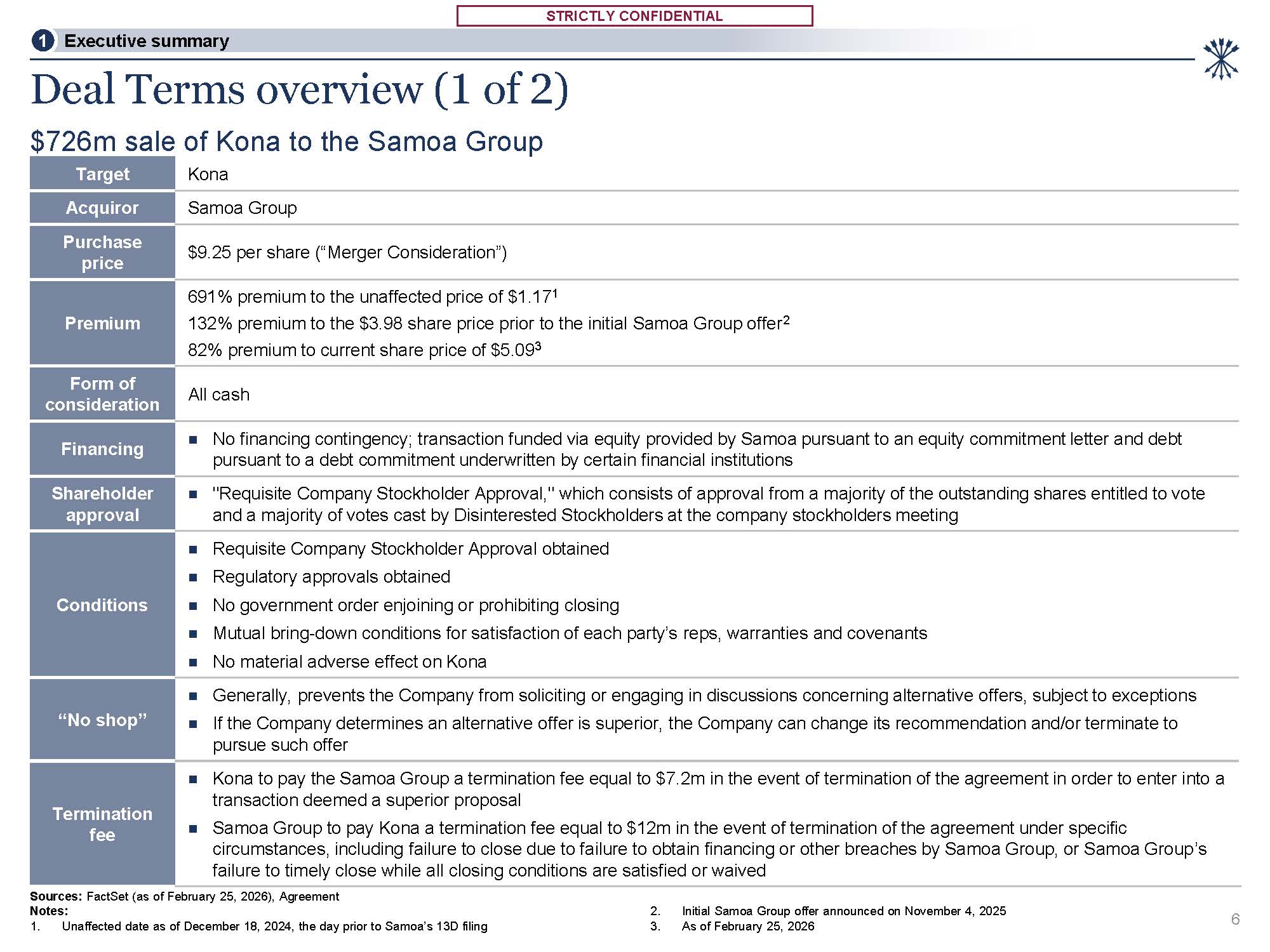 STRICTLY CONFIDENTIAL  STRICTLY CONFIDENTIAL  Deal Terms overview (1 of 2)  6  Sources: FactSet (as of February 25, 2026), Agreement  Notes:  1. Unaffected date as of December 18, 2024, the day prior to Samoa’s 13D filing  Initial Samoa Group offer announced on November 4, 2025  As of February 25, 2026  $726m sale of Kona to the Samoa Group  1 Executive summary  Target  Kona  Acquiror  Samoa Group  Purchase price  $9.25 per share (“Merger Consideration”)  Premium  691% premium to the unaffected price of $1.171  132% premium to the $3.98 share price prior to the initial Samoa Group offer2 82% premium to current share price of $5.093  Form of consideration  All cash  Financing  No financing contingency; transaction funded via equity provided by Samoa pursuant to an equity commitment letter and debt pursuant to a debt commitment underwritten by certain financial institutions  Shareholder approval  "Requisite Company Stockholder Approval," which consists of approval from a majority of the outstanding shares entitled to vote and a majority of votes cast by Disinterested Stockholders at the company stockholders meeting  Conditions  Requisite Company Stockholder Approval obtained  Regulatory approvals obtained  No government order enjoining or prohibiting closing  Mutual bring-down conditions for satisfaction of each party’s reps, warranties and covenants  No material adverse effect on Kona  “No shop”  Generally, prevents the Company from soliciting or engaging in discussions concerning alternative offers, subject to exceptions  If the Company determines an alternative offer is superior, the Company can change its recommendation and/or terminate to  pursue such offer  Termination fee  Kona to pay the Samoa Group a termination fee equal to $7.2m in the event of termination of the agreement in order to enter into a transaction deemed a superior proposal  Samoa Group to pay Kona a termination fee equal to $12m in the event of termination of the agreement under specific circumstances, including failure to close due to failure to obtain financing or other breaches by Samoa Group, or Samoa Group’s failure to timely close while all closing conditions are satisfied or waived