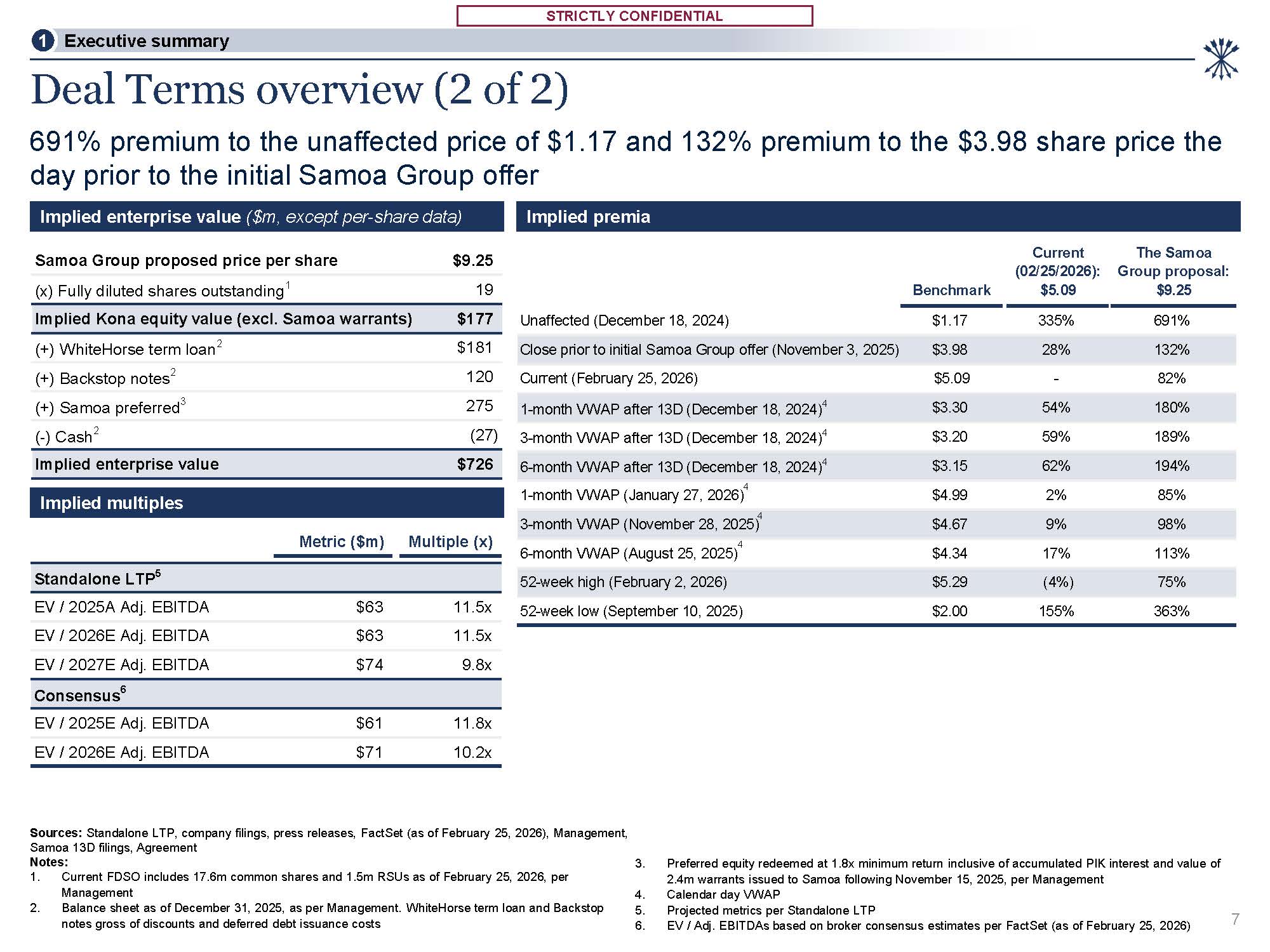 STRICTLY CONFIDENTIAL  4  6-month VWAP (August 25, 2025)  $4.34  17%  113%  52-week high (February 2, 2026)  $5.29  (4%)  75%  52-week low (September 10, 2025)  $2.00  155%  363%  Sources: Standalone LTP, company filings, press releases, FactSet (as of February 25, 2026), Management, Samoa 13D filings, Agreement  Notes:  Current FDSO includes 17.6m common shares and 1.5m RSUs as of February 25, 2026, per Management  Balance sheet as of December 31, 2025, as per Management. WhiteHorse term loan and Backstop notes gross of discounts and deferred debt issuance costs  3. Preferred equity redeemed at 1.8x minimum return inclusive of accumulated PIK interest and value of  2.4m warrants issued to Samoa following November 15, 2025, per Management  Calendar day VWAP  Projected metrics per Standalone LTP  EV / Adj. EBITDAs based on broker consensus estimates per FactSet (as of February 25, 2026)  Deal Terms overview (2 of 2)  Implied enterprise value ($m, except per-share data)  Implied premia  7  1 Executive summary  691% premium to the unaffected price of $1.17 and 132% premium to the $3.98 share price the  day prior to the initial Samoa Group offer  Implied multiples  Metric ($m) Multiple (x)  Standalone LTP5  EV / 2025A Adj. EBITDA  $63  11.5x  EV / 2026E Adj. EBITDA  $63  11.5x  EV / 2027E Adj. EBITDA  $74  9.8x  Consensus6  EV / 2025E Adj. EBITDA  $61  11.8x  EV / 2026E Adj. EBITDA  $71  10.2x  4  1-month VWAP (January 27, 2026)  $4.99  2%  85%  4  3-month VWAP (November 28, 2025)  $4.67  9%  98%  Samoa Group proposed price per share  $9.25  Current  (02/25/2026):  The Samoa  Group proposal:  (x) Fully diluted shares outstanding1  19  Benchmark  $5.09  $9.25  Implied Kona equity value (excl. Samoa warrants)  $177  Unaffected (December 18, 2024)  $1.17  335%  691%  (+) WhiteHorse term loan2  $181  Close prior to initial Samoa Group offer (November 3, 2025)  $3.98  28%  132%  (+) Backstop notes2  120  Current (February 25, 2026)  $5.09  -  82%  (+) Samoa preferred3  275  1-month VWAP after 13D (December 18, 2024)4  $3.30  54%  180%  (-) Cash2  (27)  3-month VWAP after 13D (December 18, 2024)4  $3.20  59%  189%  Implied enterprise value  $726  6-month VWAP after 13D (December 18, 2024)4  $3.15  62%  194%
