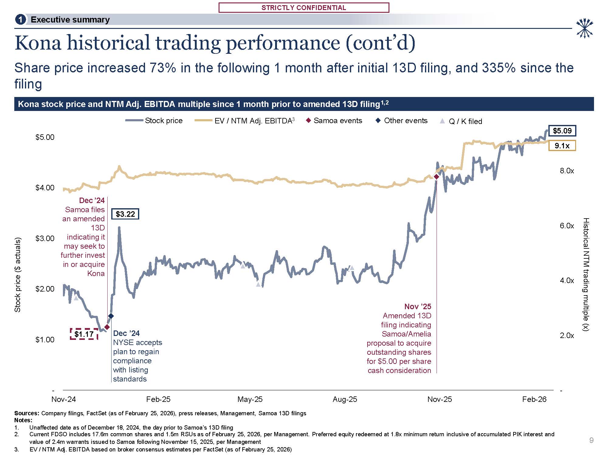 STRICTLY CONFIDENTIAL  STRICTLY CONFIDENTIAL  -  2.0x  4.0x  6.0x  8.0x  -  Nov-24 Feb-25 May-25  Sources: Company filings, FactSet (as of February 25, 2026), press releases, Management, Samoa 13D filings  Notes:  $1.00  $2.00  $3.00  $4.00  $5.00  Aug-25  Nov-25  Feb-26  Kona historical trading performance (cont’d)  Share price increased 73% in the following 1 month after initial 13D filing, and 335% since the  filing  Kona stock price and NTM Adj. EBITDA multiple since 1 month prior to amended 13D filing1,2  9.1x  $1.17  $5.09  $3.22  Dec ’24 Samoa files an amended  13D  indicating it may seek to further invest in or acquire  Kona  Historical NTM trading multiple (x)  Dec ’24 NYSE accepts plan to regain compliance with listing standards  Unaffected date as of December 18, 2024, the day prior to Samoa’s 13D filing  Current FDSO includes 17.6m common shares and 1.5m RSUs as of February 25, 2026, per Management. Preferred equity redeemed at 1.8x minimum return inclusive of accumulated PIK interest and  value of 2.4m warrants issued to Samoa following November 15, 2025, per Management  EV / NTM Adj. EBITDA based on broker consensus estimates per FactSet (as of February 25, 2026)  Nov ’25 Amended 13D filing indicating Samoa/Amelia proposal to acquire outstanding shares for $5.00 per share cash consideration  9  1 Executive summary  Stock price ($ actuals)  Stock price EV / NTM Adj. EBITDA3 Samoa events Other events Q / K filed