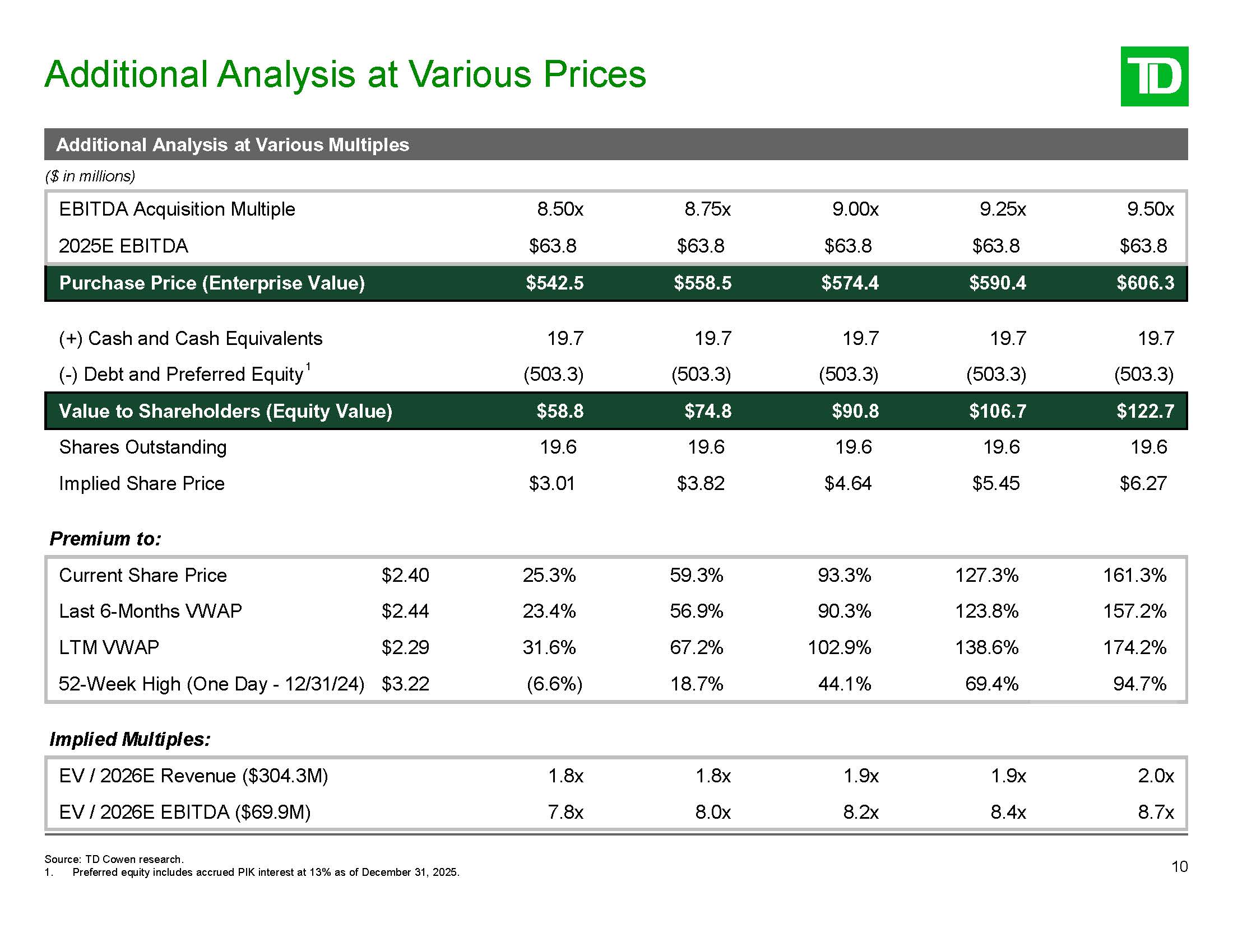 (+) Cash and Cash Equivalents  19.7  19.7  19.7  19.7  19.7  (-) Debt and Preferred Equity1  (503.3)  (503.3)  (503.3)  (503.3)  (503.3)  Value to Shareholders (Equity Value)  $58.8  $74.8  $90.8  $106.7  $122.7  Shares Outstanding  Implied Share Price  Premium to:  19.6  $3.01  19.6  $3.82  19.6  $4.64  19.6  $5.45  19.6  $6.27  Current Share Price  $2.40  25.3%  59.3%  93.3%  127.3%  161.3%  Last 6-Months VWAP  $2.44  23.4%  56.9%  90.3%  123.8%  157.2%  LTM VWAP  $2.29  31.6%  67.2%  102.9%  138.6%  174.2%  52-Week High (One Day - 12/31/24)  $3.22  (6.6%)  18.7%  44.1%  69.4%  94.7%  Implied Multiples:  EV / 2026E Revenue ($304.3M)  1.8x  1.8x  1.9x  1.9x  2.0x  EV / 2026E EBITDA ($69.9M)  7.8x  8.0x  8.2x  8.4x  8.7x  Additional Analysis at Various Prices  10  Source: TD Cowen research.  1. Preferred equity includes accrued PIK interest at 13% as of December 31, 2025.  Additional Analysis at Various Multiples  ($ in millions)  EBITDA Acquisition Multiple  2025E EBITDA  8.50x  $63.8  8.75x  $63.8  9.00x  $63.8  9.25x  $63.8  9.50x  $63.8  Purchase Price (Enterprise Value)  $542.5  $558.5  $574.4  $590.4  $606.3