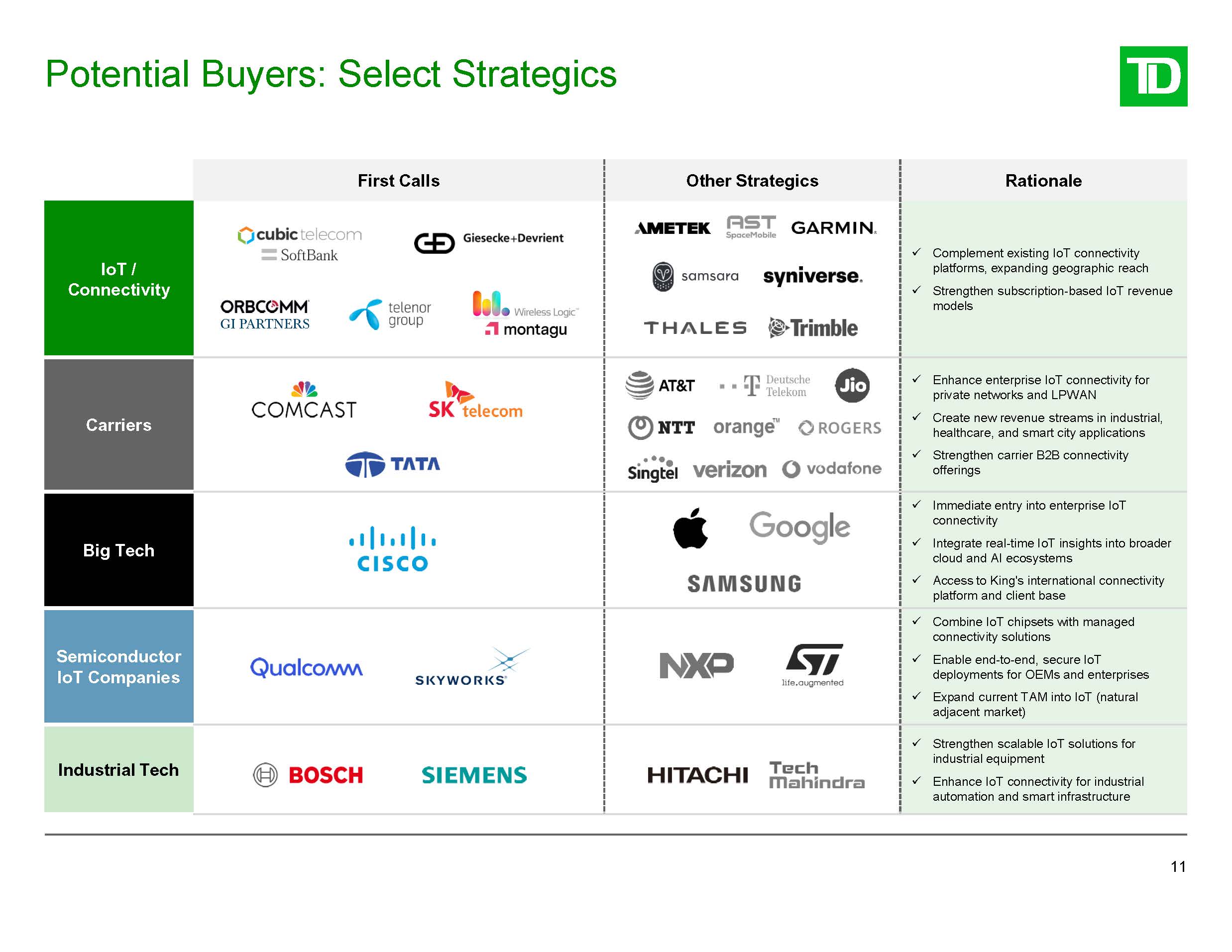 Potential Buyers: Select Strategics  11  First Calls  Other Strategics  Rationale  IoT / Connectivity  Complement existing IoT connectivity platforms, expanding geographic reach  Strengthen subscription-based IoT revenue models  Carriers  Enhance enterprise IoT connectivity for private networks and LPWAN  Create new revenue streams in industrial, healthcare, and smart city applications  Strengthen carrier B2B connectivity  offerings  Big Tech  Immediate entry into enterprise IoT connectivity  Integrate real-time IoT insights into broader cloud and AI ecosystems  Access to King's international connectivity  platform and client base  Semiconductor IoT Companies  Combine IoT chipsets with managed connectivity solutions  Enable end-to-end, secure IoT deployments for OEMs and enterprises  Expand current TAM into IoT (natural adjacent market)  Industrial Tech  Strengthen scalable IoT solutions for  industrial equipment  Enhance IoT connectivity for industrial automation and smart infrastructure