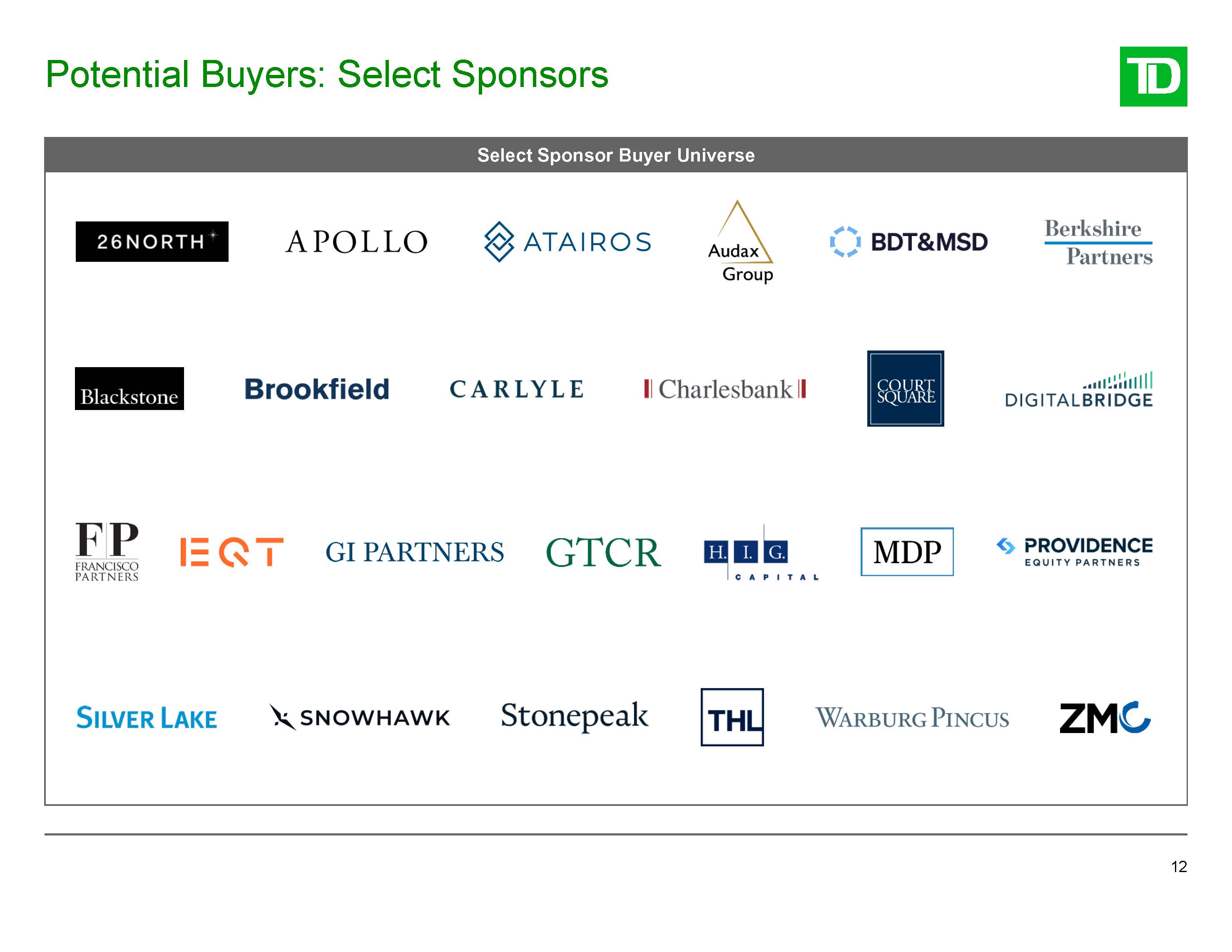 Potential Buyers: Select Sponsors  12  Select Sponsor Buyer Universe