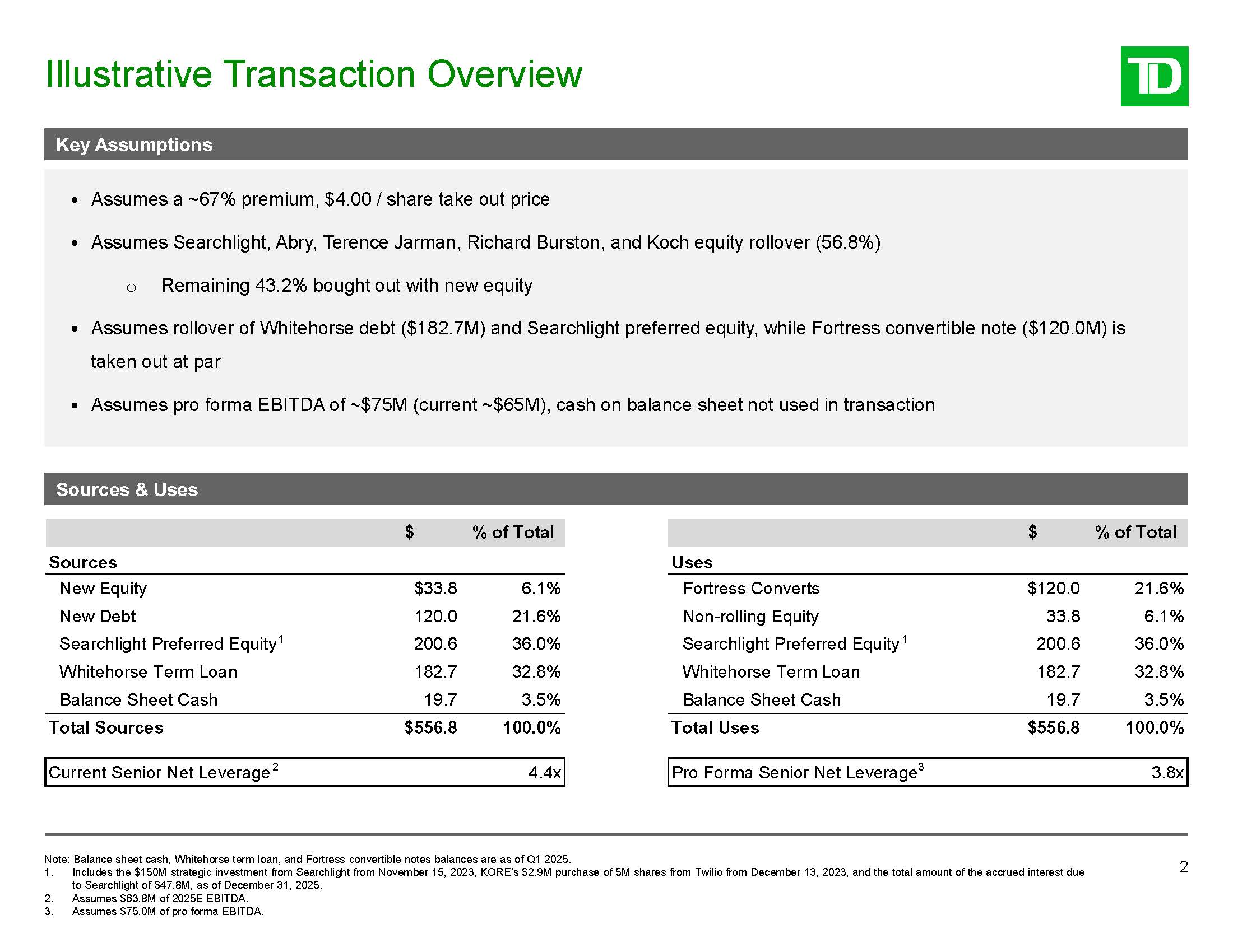 Illustrative Transaction Overview  2  Note: Balance sheet cash, Whitehorse term loan, and Fortress convertible notes balances are as of Q1 2025.  Includes the $150M strategic investment from Searchlight from November 15, 2023, KORE’s $2.9M purchase of 5M shares from Twilio from December 13, 2023, and the total amount of the accrued interest due to Searchlight of $47.8M, as of December 31, 2025.  Assumes $63.8M of 2025E EBITDA.  Assumes $75.0M of pro forma EBITDA.  Key Assumptions  Assumes a ~67% premium, $4.00 / share take out price  Assumes Searchlight, Abry, Terence Jarman, Richard Burston, and Koch equity rollover (56.8%)  Remaining 43.2% bought out with new equity  Assumes rollover of Whitehorse debt ($182.7M) and Searchlight preferred equity, while Fortress convertible note ($120.0M) is taken out at par  Assumes pro forma EBITDA of ~$75M (current ~$65M), cash on balance sheet not used in transaction  Sources & Uses  New Equity  $33.8  6.1%  Fortress Converts  $120.0  21.6%  New Debt  120.0  21.6%  Non-rolling Equity  33.8  6.1%  Searchlight Preferred Equity1  200.6  36.0%  Searchlight Preferred Equity 1  200.6  36.0%  Whitehorse Term Loan  182.7  32.8%  Whitehorse Term Loan  182.7  32.8%  Balance Sheet Cash  19.7  3.5%  Balance Sheet Cash  19.7  3.5%  Total Sources  $556.8  100.0%  Total Uses  $556.8  100.0%  Current Senior Net Leverage2  4.4x  Pro Forma Senior Net Leverage3  3.8x  $ % of Total  $ % of Total   Sources    Uses
