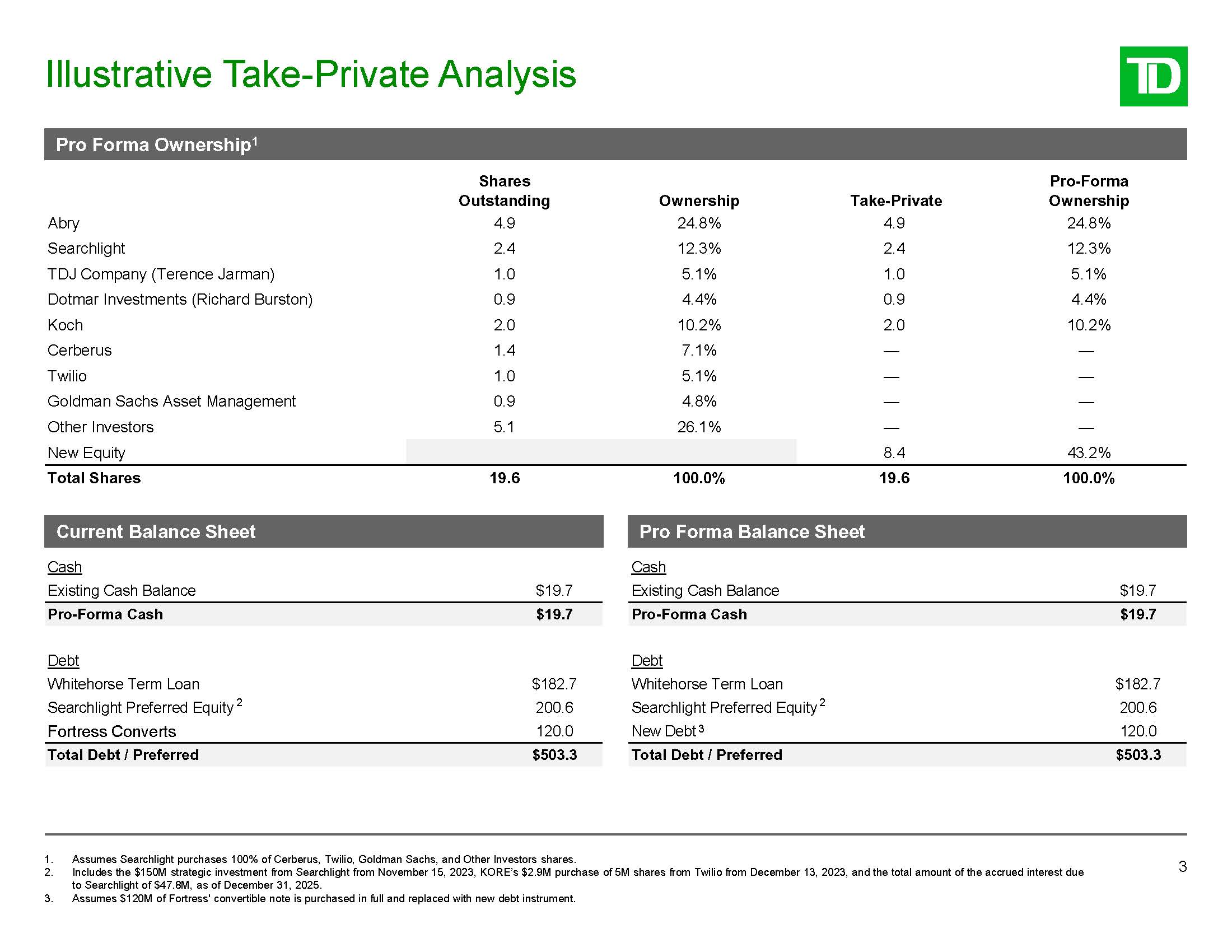 Shares  Outstanding  Ownership  Take-Private  Pro-Forma  Ownership  Abry  4.9  24.8%  4.9  24.8%  Searchlight  2.4  12.3%  2.4  12.3%  TDJ Company (Terence Jarman)  1.0  5.1%  1.0  5.1%  Dotmar Investments (Richard Burston)  0.9  4.4%  0.9  4.4%  Koch  2.0  10.2%  2.0  10.2%  Cerberus  1.4  7.1%  —  —  Twilio  1.0  5.1%  —  —  Goldman Sachs Asset Management  0.9  4.8%  —  —  Other Investors  5.1  26.1%  —  —  New Equity  8.4  43.2%  Total Shares  19.6  100.0%  19.6  100.0%  Current Balance Sheet  Pro Forma Balance Sheet  Cash  Cash  Existing Cash Balance  $19.7  Existing Cash Balance  $19.7  Pro-Forma Cash  $19.7  Pro-Forma Cash  $19.7  Debt  Debt  Whitehorse Term Loan  $182.7  Whitehorse Term Loan  $182.7  Searchlight Preferred Equity 2  200.6  Searchlight Preferred Equity 2  200.6  Fortress Converts  120.0  New Debt 3  120.0  Total Debt / Preferred  $503.3  Total Debt / Preferred  $503.3  Illustrative Take-Private Analysis  3  Assumes Searchlight purchases 100% of Cerberus, Twilio, Goldman Sachs, and Other Investors shares.  Includes the $150M strategic investment from Searchlight from November 15, 2023, KORE’s $2.9M purchase of 5M shares from Twilio from December 13, 2023, and the total amount of the accrued interest due to Searchlight of $47.8M, as of December 31, 2025.  Assumes $120M of Fortress' convertible note is purchased in full and replaced with new debt instrument.  Pro Forma Ownership1