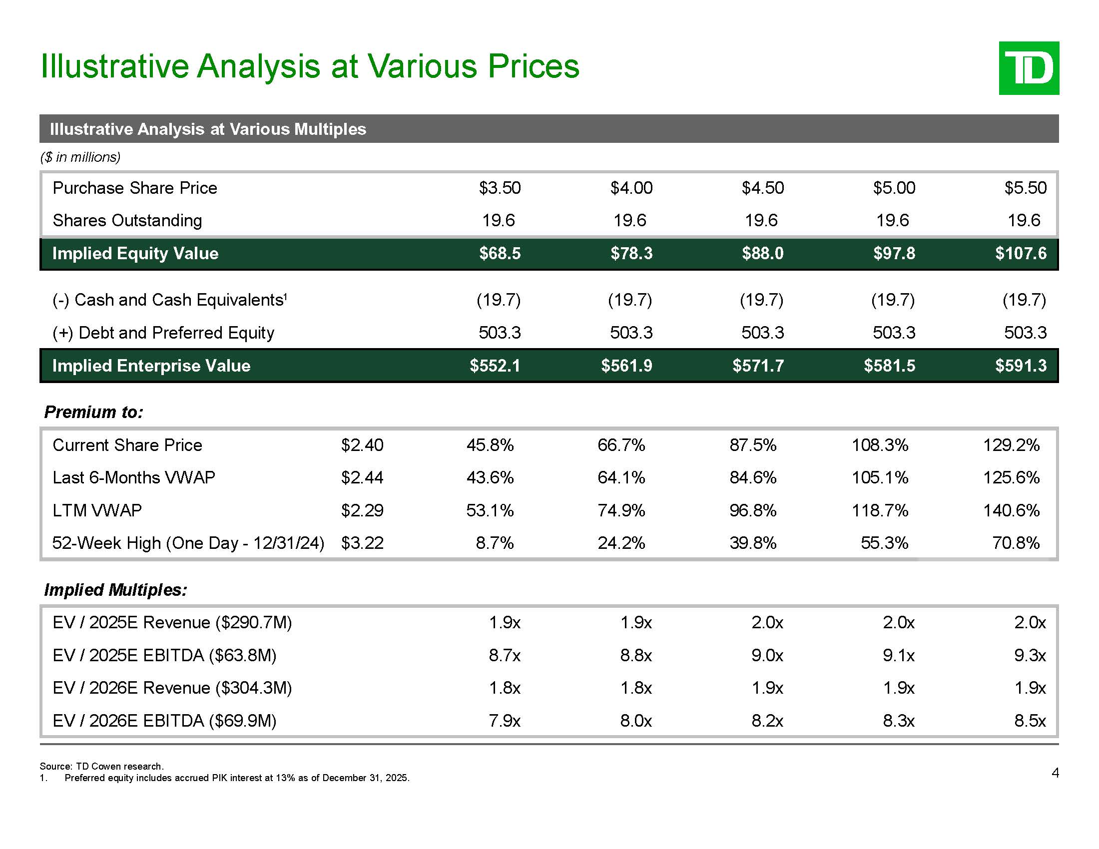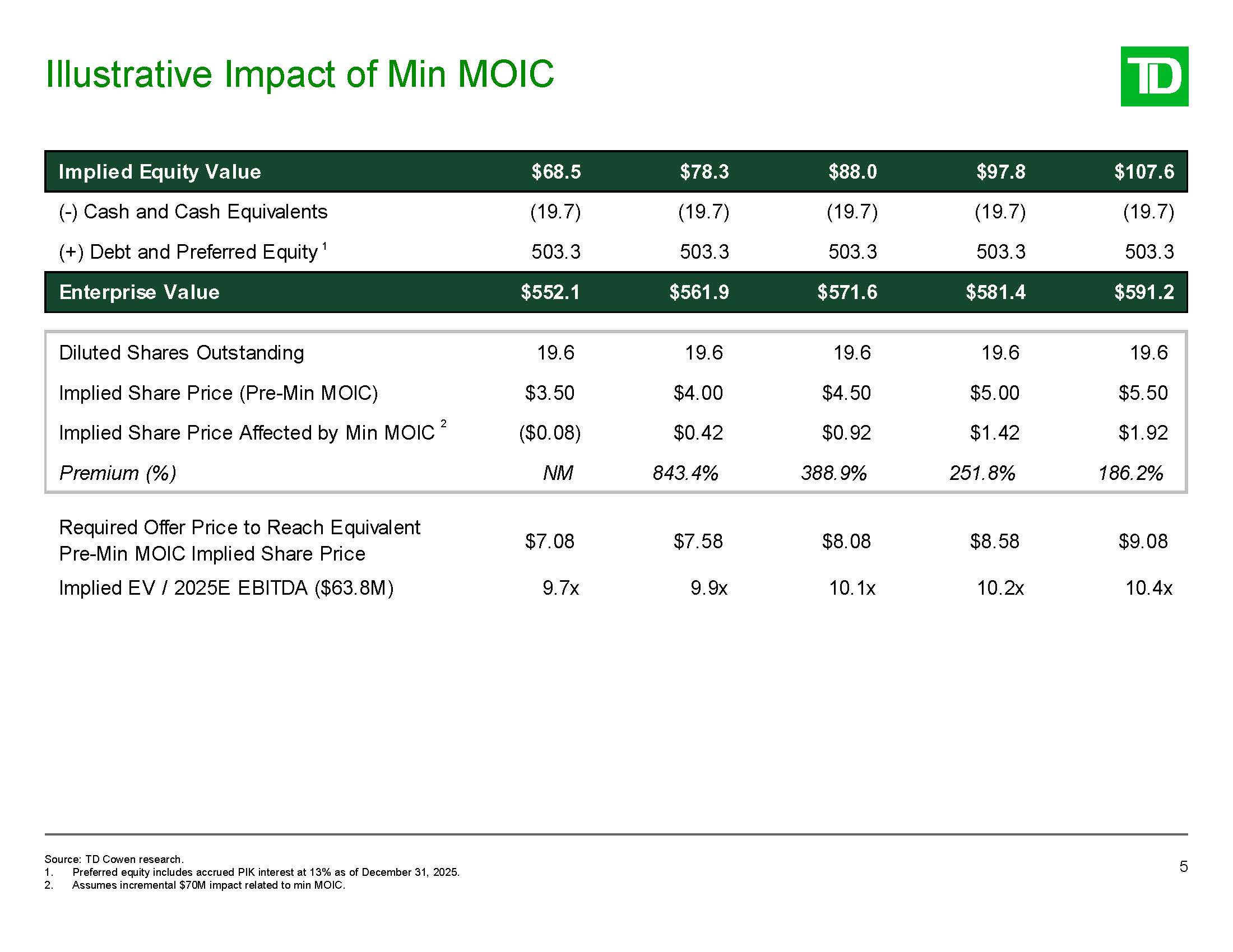 Illustrative Impact of Min MOIC  5  Implied Equity Value  $68.5  $78.3  $88.0  $97.8  $107.6  (-) Cash and Cash Equivalents  (19.7)  (19.7)  (19.7)  (19.7)  (19.7)  (+) Debt and Preferred Equity 1  503.3  503.3  503.3  503.3  503.3  Enterprise Value  $552.1  $561.9  $571.6  $581.4  $591.2  Diluted Shares Outstanding  19.6  19.6  19.6  19.6  19.6  Implied Share Price (Pre-Min MOIC)  $3.50  $4.00  $4.50  $5.00  $5.50  Implied Share Price Affected by Min MOIC 2  ($0.08)  $0.42  $0.92  $1.42  $1.92  Premium (%)  NM  843.4%  388.9%  251.8%  186.2%  Required Offer Price to Reach Equivalent Pre-Min MOIC Implied Share Price  $7.08  $7.58  $8.08  $8.58  $9.08  Implied EV / 2025E EBITDA ($63.8M)  9.7x  9.9x  10.1x  10.2x  10.4x  Source: TD Cowen research.  Preferred equity includes accrued PIK interest at 13% as of December 31, 2025.  Assumes incremental $70M impact related to min MOIC.