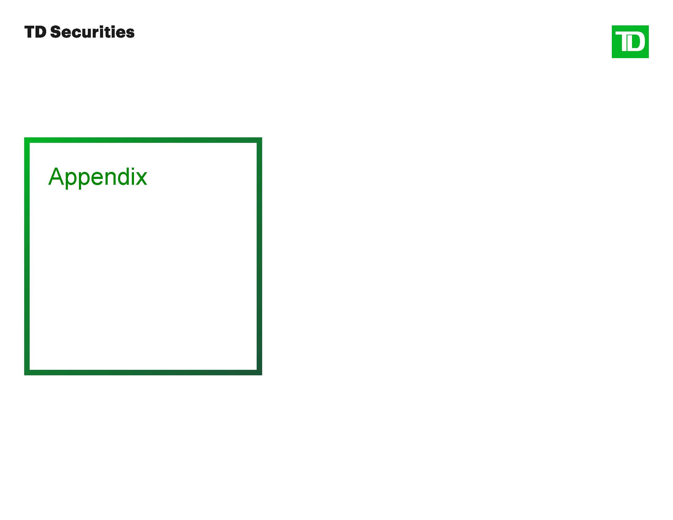 Disclaimer  These materials were prepared exclusively for the benefit and internal use of the TD Securities client (the “Company” or “you”) to whom they are directly addressed and delivered in order to assist the Company in evaluating, on a preliminary basis, the feasibility of a possible transaction or transactions. These materials were compiled or prepared on a confidential basis solely and exclusively for the use of the Company and not with a view to public disclosure or to conform to any disclosure standards under any securities laws or other laws, rules or regulations. The information is for discussion purposes only, and must not be copied or reproduced, or disclosed, distributed or passed to others at any time without the prior written consent of TD Securities. These materials may not be used for any purpose other than as may be specifically contemplated by a written agreement with TD Securities. These materials and the information contained herein do not purport to be all-inclusive or to contain all of the information, or to identify or suggest all of the risks (direct or indirect), that may be associated with any possible transaction or transactions or that may be necessary to evaluate any possible transaction or transactions.  The information in this presentation reflects prevailing conditions and our views as of this date, all of which are accordingly subject to change. TD Securities’ opinions and estimates constitute TD Securities’ judgment and should be regarded as indicative, preliminary and for illustrative purposes only. In preparing the materials, TD Securities has relied upon documents and information prepared for or supplied to TD Securities by the Company and other sources, without independent verification by TD Securities. Any estimates and projections contained herein have been based upon estimates and projections contained in such documents and third-party sources, and there is no assurance that such estimates and projections will be realized.  None of TD Securities, its affiliates or its or their respective officers, directors, employees, advisors or representatives (“Representatives”) makes any representation or warranty (express or implied) as to the accuracy or completeness of any information contained herein or any other written or oral communication transmitted or made available to you in connection with an evaluation of a possible transaction, and nothing contained herein or therein is, or shall be construed or relied upon as, a representation or warranty, whether as to the past, present or future. TD Securities does not have any obligation to update or otherwise revise the materials and information contained herein (though all information contained herein is subject to revision).  TD Securities believes that these materials must be considered as a whole and that selecting portions of the analyses and the factors considered by TD Securities, without considering all of the factors and analyses together, could create a misleading view of the presentation. The preparation of a presentation such as this is complex and is not necessarily susceptible of partial analysis or summary description. Any attempt to do so could lend to undue emphasis on any particular factor or analysis.  Any market valuations contained herein are indicative values as of the time and date indicated for illustrative purposes only. TD Securities does not warrant their completeness or accuracy. Any price or valuation constitutes our judgment and is subject to change without notice. Investors should understand that statements regarding future prospects may not be realized. TD Securities cannot guarantee that different prices and/or valuations would not be available elsewhere and suggests that valuations from other sources be obtained for comparison. Actual quotations could differ subject to market conditions.  TD Securities’ policies prohibit employees from offering, directly or indirectly, a favorable research rating or specific price target, or offering to change a rating or price target, to a subject company as consideration or inducement for the receipt of business or for compensation. TD Securities also prohibits its research analysts from being compensated for involvement in investment banking transactions except to the extent that such participation is intended to benefit investors.  Nothing herein should be construed as tax, accounting, regulatory or legal advice. TD Securities is not acting in any fiduciary, advisory, agency or similar capacity to the Company. Prior to entering into any possible transaction, you should determine the financial suitability, risks and merits of such transaction, including all economic, legal, tax, accounting or any other consequences associated therewith.  Neither TD Securities nor any of its Representatives will be liable to the Company or any third party, whether for negligence, breach of contract or otherwise, for any loss or damage of whatsoever nature suffered by the Company or a third party (including, without limitation, direct loss or damage, indirect or consequential loss or damage, loss of goodwill, loss of business opportunity, loss of data or loss of profit) arising from TD Securities providing you with these materials or the information contained herein or any other written or oral communication transmitted or made available to you in connection with an evaluation of a possible transaction. TD Securities and its affiliates expressly disclaim any and all liability relating to, resulting from or based, in whole or in part, on such information, errors therein or omissions therefrom.  These materials do not constitute a commitment, express or implied, by TD Securities or any of its affiliates to enter into any transaction, underwrite, subscribe for, purchase or place any securities or to extend or arrange credit or to otherwise provide any financing or other services. Nothing in these materials (i) may be used