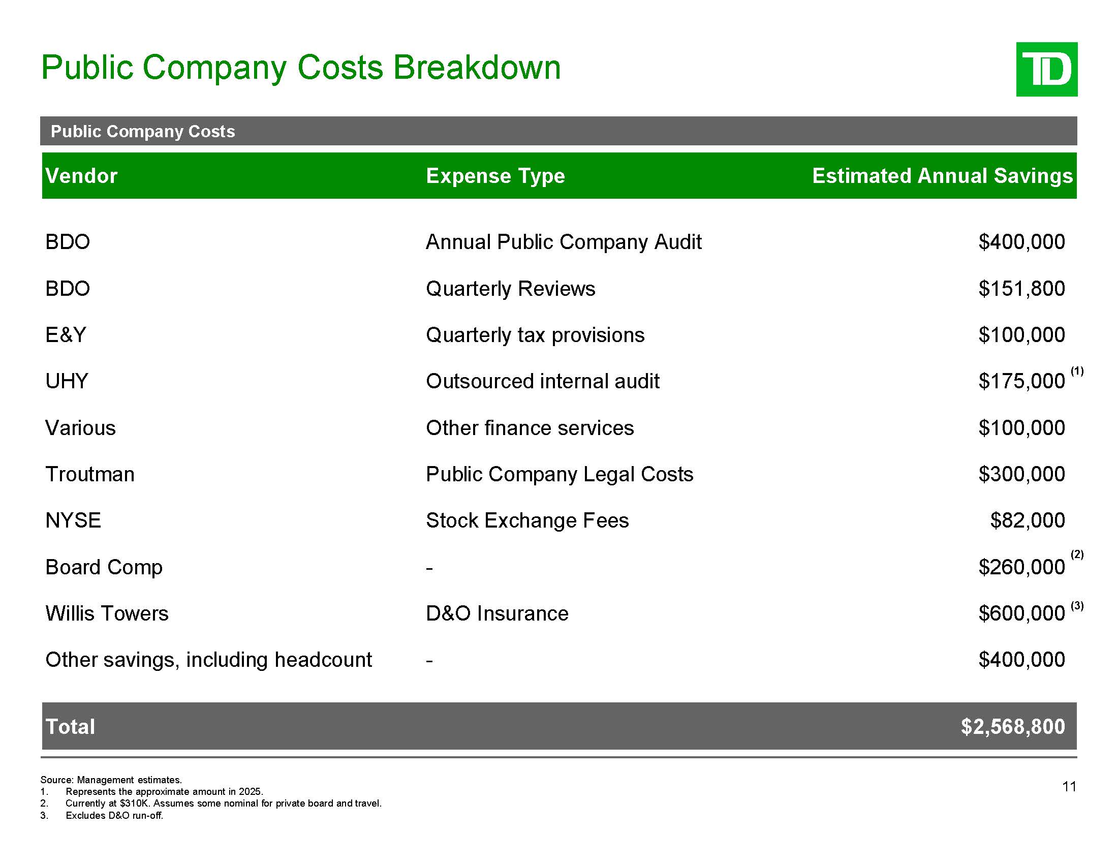 Public Company Costs Breakdown  11  Public Company Costs  Vendor  Expense Type  Estimated Annual Savings  BDO  Annual Public Company Audit  $400,000  BDO  Quarterly Reviews  $151,800  E&Y  Quarterly tax provisions  $100,000  Source: Management estimates.  Represents the approximate amount in 2025.  Currently at $310K. Assumes some nominal for private board and travel.  Excludes D&O run-off.  UHY  Outsourced internal audit  $175,000  Various  Other finance services  $100,000  Troutman  Public Company Legal Costs  $300,000  NYSE  Stock Exchange Fees  $82,000  Board Comp  -  (2)  $260,000  $600,000 (3)  Willis Towers  D&O Insurance  Other savings, including headcount  -  $400,000  Total $2,568,800  (1)