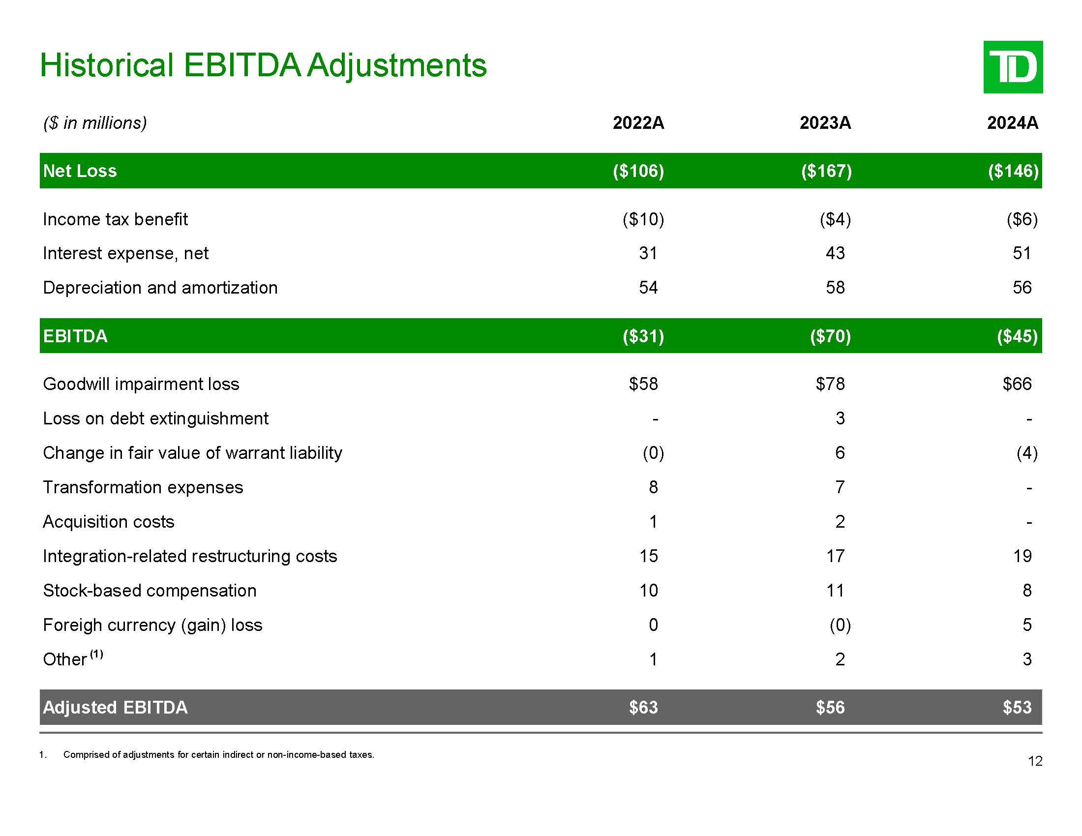Historical EBITDA Adjustments  ($ in millions)  2022A  2023A  2024A  Net Loss  ($106)  ($167)  ($146)  Income tax benefit  ($10)  ($4)  ($6)  Interest expense, net  31  43  51  Depreciation and amortization  54  58  56  EBITDA  ($31)  ($70)  ($45)  Goodwill impairment loss  $58  $78  $66  Loss on debt extinguishment  -  3  -  Change in fair value of warrant liability  (0)  6  (4)  Transformation expenses  8  7  -  Acquisition costs  1  2  -  Integration-related restructuring costs  15  17  19  Stock-based compensation  10  11  8  Foreigh currency (gain) loss  0  (0)  5  Other (1)  1  2  3  Adjusted EBITDA  $63  $56  $53  12  1. Comprised of adjustments for certain indirect or non-income-based taxes.