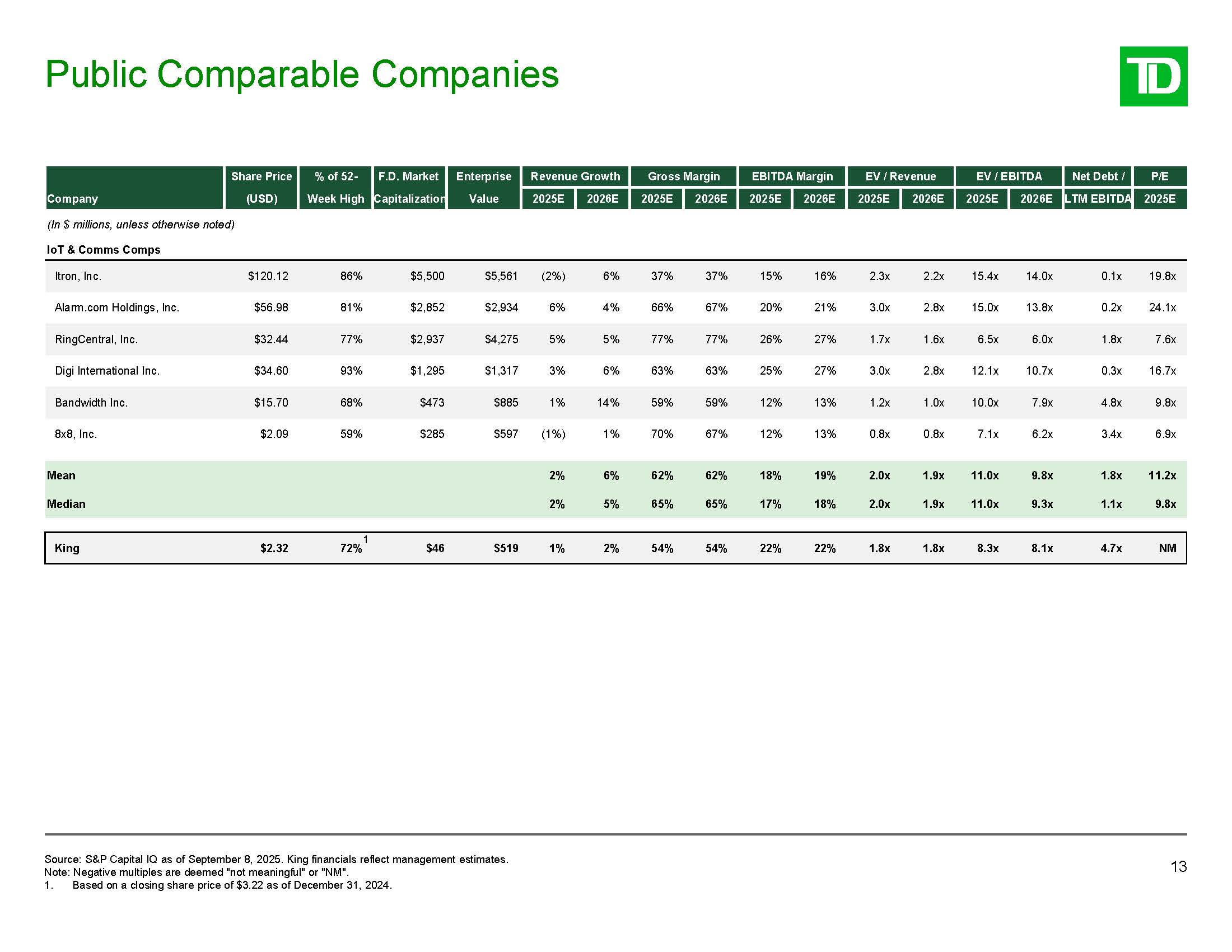 Company  Share Price  (USD)  % of 52-  Week High  F.D. Market  Capitalization  Enterprise  Value  Revenue Growth  Gross Margin  EBITDA Margin  EV / Revenue  EV / EBITDA  Net Debt /  P/E  2025E  2026E  2025E  2026E  2025E  2026E  2025E  2026E  2025E  2026E  LTM EBITDA  2025E  Itron, Inc.  $120.12  86%  $5,500  $5,561  (2%)  6%  37%  37%  15%  16%  2.3x  2.2x  15.4x  14.0x  0.1x  19.8x  Alarm.com Holdings, Inc.  $56.98  81%  $2,852  $2,934  6%  4%  66%  67%  20%  21%  3.0x  2.8x  15.0x  13.8x  0.2x  24.1x  RingCentral, Inc.  $32.44  77%  $2,937  $4,275  5%  5%  77%  77%  26%  27%  1.7x  1.6x  6.5x  6.0x  1.8x  7.6x  Digi International Inc.  $34.60  93%  $1,295  $1,317  3%  6%  63%  63%  25%  27%  3.0x  2.8x  12.1x  10.7x  0.3x  16.7x  Bandwidth Inc.  $15.70  68%  $473  $885  1%  14%  59%  59%  12%  13%  1.2x  1.0x  10.0x  7.9x  4.8x  9.8x  8x8, Inc.  $2.09  59%  $285  $597  (1%)  1%  70%  67%  12%  13%  0.8x  0.8x  7.1x  6.2x  3.4x  6.9x  Mean  2%  6%  62%  62%  18%  19%  2.0x  1.9x  11.0x  9.8x  1.8x  11.2x  Median  2%  5%  65%  65%  17%  18%  2.0x  1.9x  11.0x  9.3x  1.1x  9.8x  King  $2.32  $46  $519  1%  2%  54%  54%  22%  22%  1.8x  1.8x  8.3x  8.1x  4.7x  NM  (In $ millions, unless otherwise noted)  IoT & Comms Comps  1  72%  Public Comparable Companies  13  Source: S&P Capital IQ as of September 8, 2025. King financials reflect management estimates.  Note: Negative multiples are deemed "not meaningful" or "NM".  1. Based on a closing share price of $3.22 as of December 31, 2024.