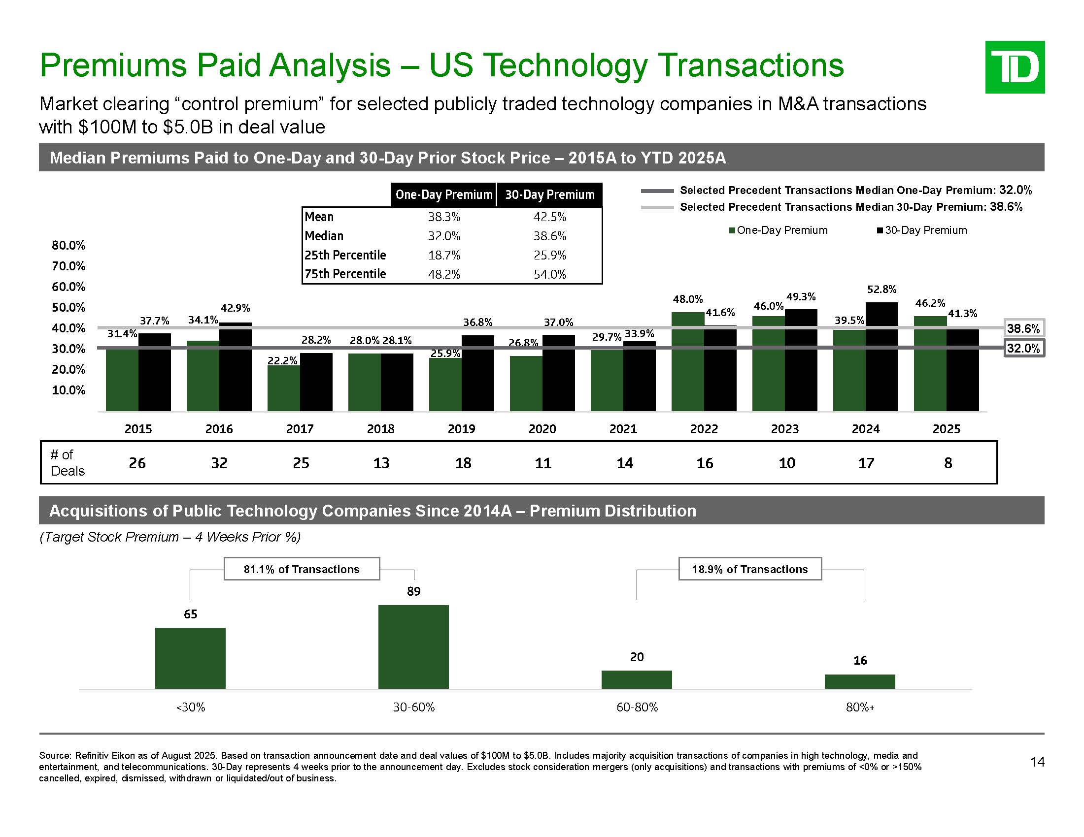 Premiums Paid Analysis – US Technology Transactions  14  Source: Refinitiv Eikon as of August 2025. Based on transaction announcement date and deal values of $100M to $5.0B. Includes majority acquisition transactions of companies in high technology, media and entertainment, and telecommunications. 30-Day represents 4 weeks prior to the announcement day. Excludes stock consideration mergers (only acquisitions) and transactions with premiums of <0% or >150% cancelled, expired, dismissed, withdrawn or liquidated/out of business.  Median Premiums Paid to One-Day and 30-Day Prior Stock Price – 2015A to YTD 2025A  Market clearing “control premium” for selected publicly traded technology companies in M&A transactions  with $100M to $5.0B in deal value  34.1%  22.2%  25.9%  26.8%  29.7%  46.0%  39.5%  37.7%  31.4%  42.9%  28.2%  28.0% 28.1%  36.8%  37.0%  33.9%  41.6%  49.3%  46.2%  41.3%  52.8%  0.0%  80.0%  70.0%  60.0%  50.0%  40.0%  30.0%  20.0%  10.0%  Chart Title  Mean  One-Day Premium 30-Day Premium  38.3% 42.5%  Median  32.0%  38.6%  25th Percentile  18.7%  25.9%  75th Percentile  48.2%  54.0%  48.0%  65  89  20  16  <30%  30-60%  60-80%  80%+  81.1% of Transactions  18.9% of Transactions  Deals  2015  2016  2017  2018  2019  2020  2021  2022  2023  2024  2025  # of 26  32  25  13  18  11  14  16  10  17  8  32.0%  38.6%  Selected Precedent Transactions Median One-Day Premium: 32.0%  Selected Precedent Transactions Median 30-Day Premium: 38.6%  One-Day Premium 30-Day Premium  Acquisitions of Public Technology Companies Since 2014A – Premium Distribution  (Target Stock Premium – 4 Weeks Prior %)