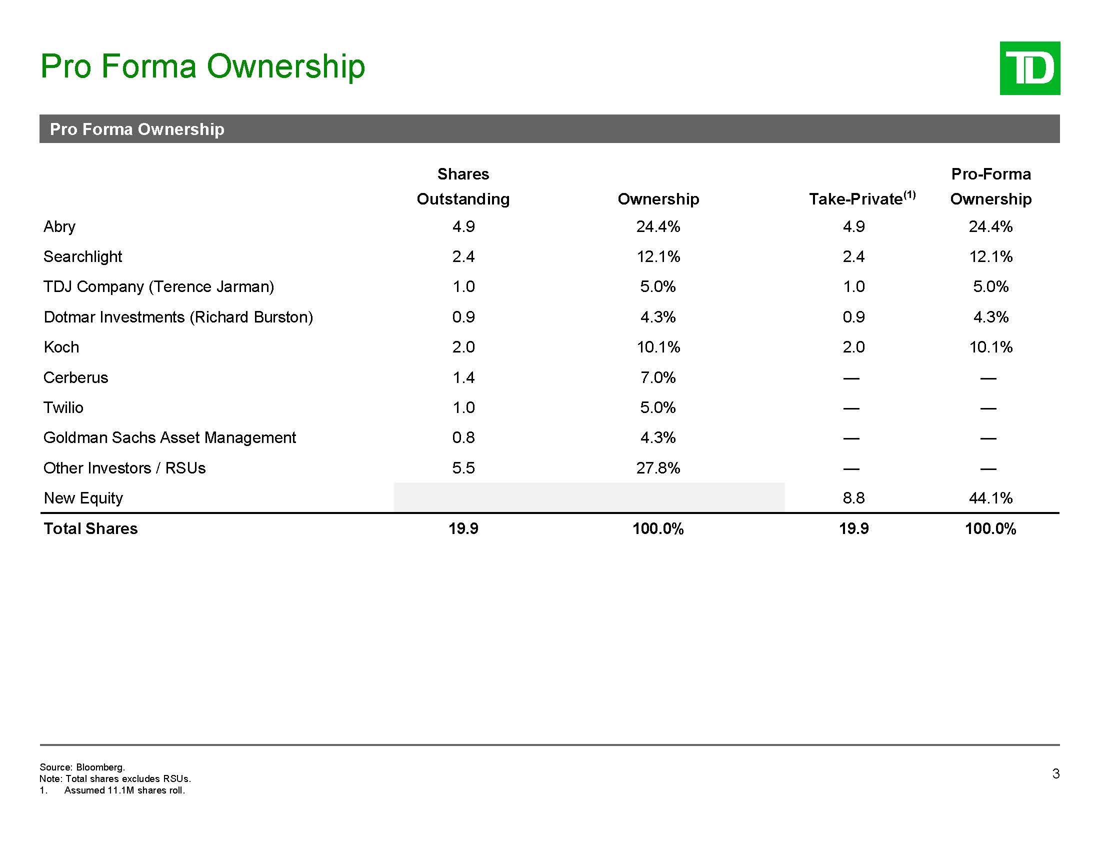 Pro Forma Ownership  3  Pro Forma Ownership  Shares Outstanding  Ownership  Take-Private(1)  Pro-Forma Ownership  Abry  4.9  24.4%  4.9  24.4%  Searchlight  2.4  12.1%  2.4  12.1%  TDJ Company (Terence Jarman)  1.0  5.0%  1.0  5.0%  Dotmar Investments (Richard Burston)  0.9  4.3%  0.9  4.3%  Koch  2.0  10.1%  2.0  10.1%  Cerberus  1.4  7.0%  —  —  Twilio  1.0  5.0%  —  —  Goldman Sachs Asset Management  0.8  4.3%  —  —  Other Investors / RSUs  5.5  27.8%  —  —  New Equity  8.8  44.1%  Total Shares  19.9  100.0%  19.9  100.0%  Source: Bloomberg.  Note: Total shares excludes RSUs.  1. Assumed 11.1M shares roll.