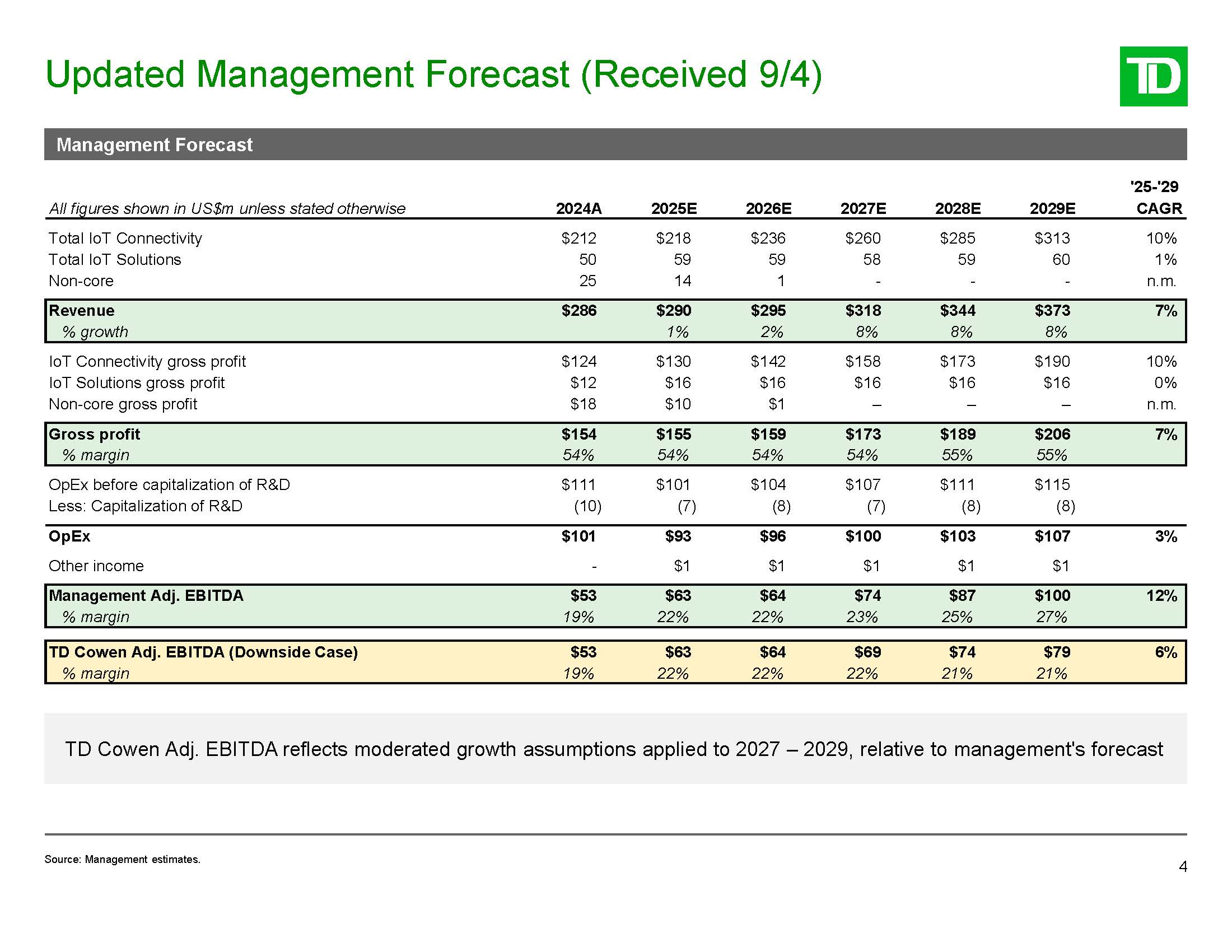 Updated Management Forecast (Received 9/4)  4  Management Forecast  TD Cowen Adj. EBITDA reflects moderated growth assumptions applied to 2027 – 2029, relative to management's forecast  Total IoT Connectivity $212  $218  $236  $260  $285  $313  10%  Total IoT Solutions 50  59  59  58  59  60  1%  Non-core 25  14  1  -  -  -  n.m.  Revenue $286  $290  $295  $318  $344  $373  7%  % growth  1%  2%  8%  8%  8%  IoT Connectivity gross profit $124  $130  $142  $158  $173  $190  10%  IoT Solutions gross profit $12  $16  $16  $16  $16  $16  0%  Non-core gross profit $18  $10  $1  –  –  –  n.m.  Gross profit $154  $155  $159  $173  $189  $206  7%  % margin 54%  54%  54%  54%  55%  55%  OpEx before capitalization of R&D $111  $101  $104  $107  $111  $115  Less: Capitalization of R&D  (10)  (7)  (8)  (7)  (8)  (8)  OpEx  Other income  $101  -  $93  $1  $96  $1  $100  $1  $103  $1  $107  $1  3%  Management Adj. EBITDA  % margin  $53  19%  $63  22%  $64  22%  $74  23%  $87  25%  $100  27%  12%  TD Cowen Adj. EBITDA (Downside Case)  $53  $63  $64  $69  $74  $79  6%  % margin  19%  22%  22%  22%  21%  21%  '25-'29  CAGR  All figures shown in US$m unless stated otherwise  2024A  2025E  2026E  2027E  2028E  2029E  Source: Management estimates.