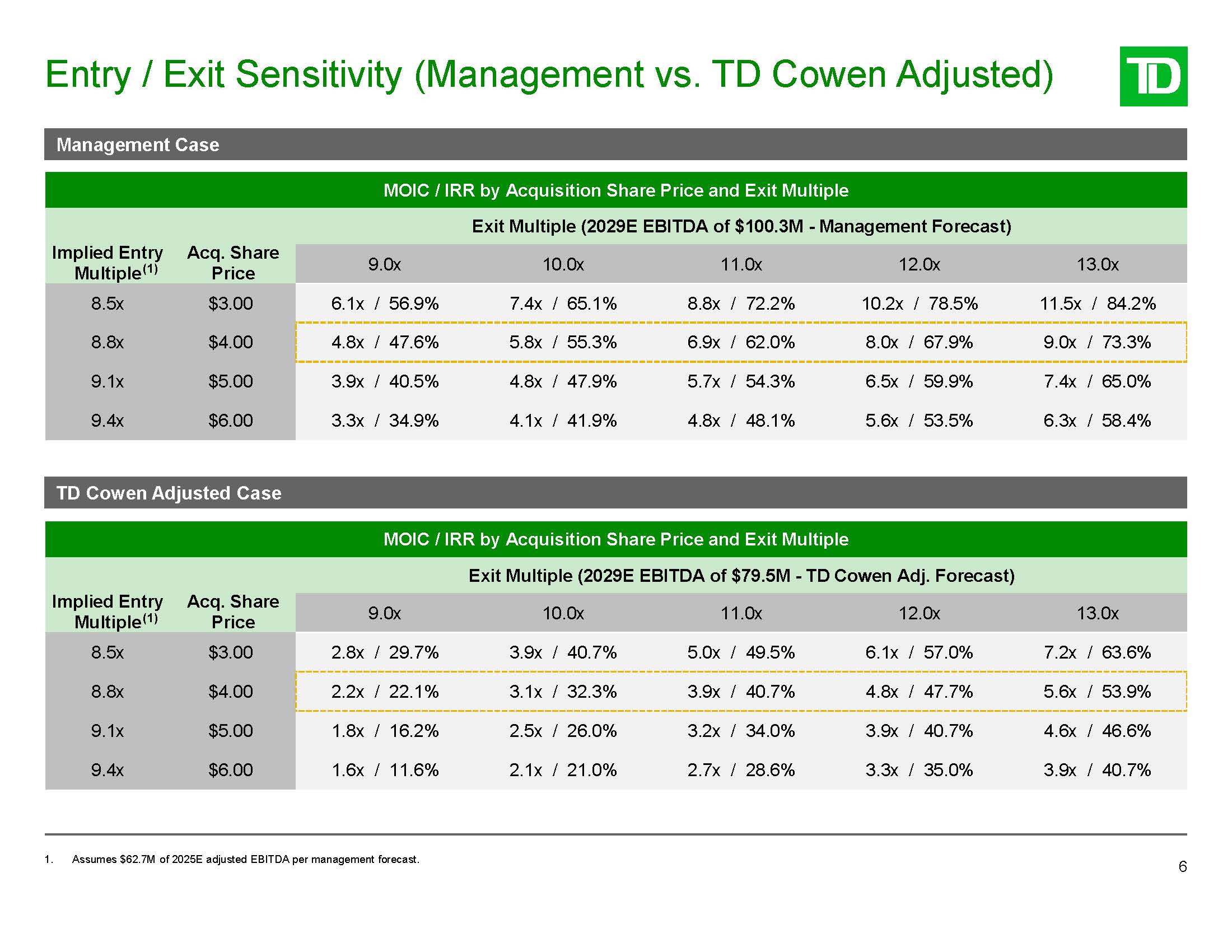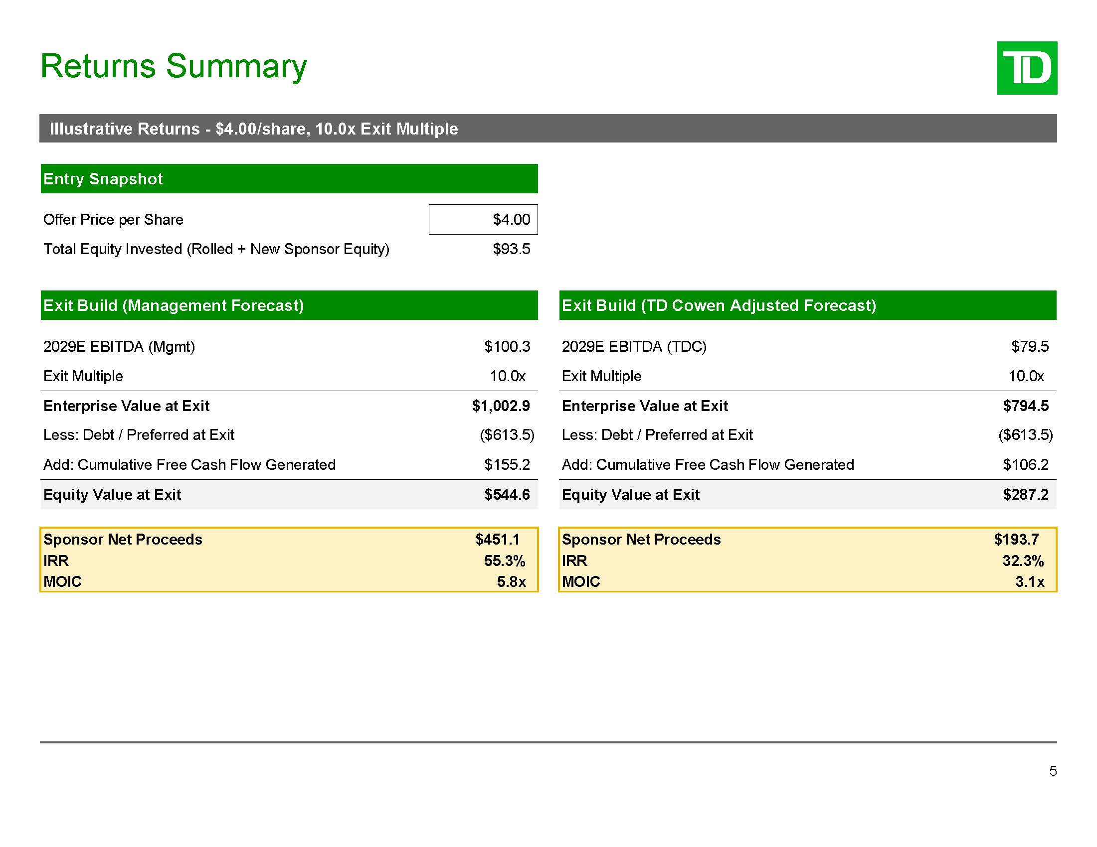 Returns Summary  5  Illustrative Returns - $4.00/share, 10.0x Exit Multiple  Entry Snapshot  Offer Price per Share  $4.00  Total Equity Invested (Rolled + New Sponsor Equity)  $93.5  Exit Build (Management Forecast)  Exit Build (TD Cowen Adjusted Forecast)  2029E EBITDA (Mgmt)  $100.3  2029E EBITDA (TDC)  $79.5  Exit Multiple  10.0x  Exit Multiple  10.0x  Enterprise Value at Exit  $1,002.9  Enterprise Value at Exit  $794.5  Less: Debt / Preferred at Exit  ($613.5)  Less: Debt / Preferred at Exit  ($613.5)  Add: Cumulative Free Cash Flow Generated  $155.2  Add: Cumulative Free Cash Flow Generated  $106.2  Equity Value at Exit  $544.6  Equity Value at Exit  $287.2  Sponsor Net Proceeds  $451.1  Sponsor Net Proceeds  $193.7  IRR  55.3%  IRR  32.3%  MOIC  5.8x  MOIC  3.1x