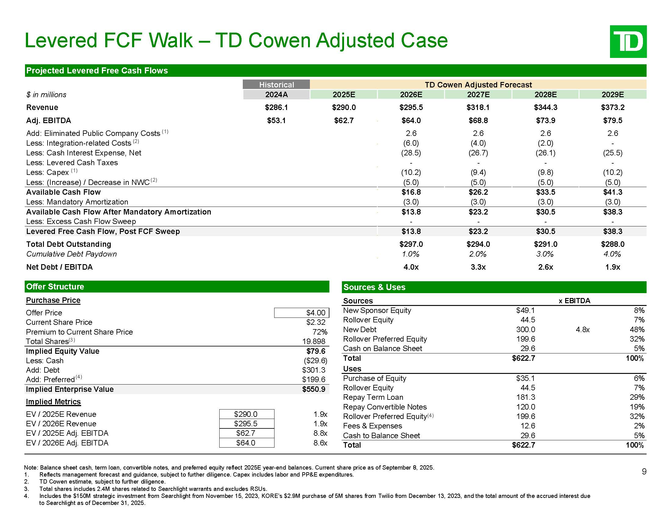 Levered FCF Walk – Management Case  8  Note: Balance sheet cash, term loan, convertible notes, and preferred equity reflect 2025E year-end balances. Current share price as of September 8, 2025.  Reflects management forecast and guidance, subject to further diligence. Capex includes labor and PP&E expenditures.  TD Cowen estimate, subject to further diligence.  Total shares includes 2.4M shares related to Searchlight warrants and excludes RSUs.  Includes the $150M strategic investment from Searchlight from November 15, 2023, KORE’s $2.9M purchase of 5M shares from Twilio from December 13, 2023, and the total amount of the accrued interest due to Searchlight as of December 31, 2025.  Implied Metrics  EV / 2025E Revenue EV / 2026E Revenue  EV / 2025E Adj. EBITDA EV / 2026E Adj. EBITDA  $290.0  $295.5  $62.7  $64.0  1.9x  1.9x  8.8x  8.6x  Sources & Uses  Sources  x EBITDA  New Sponsor Equity  $49.1  8%  Rollover Equity  44.5  7%  New Debt  300.0  4.8x  48%  Rollover Preferred Equity  199.6  32%  Cash on Balance Sheet  29.6  5%  Total  $622.7  100%  181.3  120.0  199.6  12.6  29.6  29%  19%  32%  2%  5%  Total  $622.7  100%  Offer Structure  Purchase Price  Offer Price  $4.00  Current Share Price  $2.32  Premium to Current Share Price  72%  Total Shares(3)  19.898  Implied Equity Value  $79.6  Less: Cash  ($29.6)  Add: Debt  $301.3   Uses   Add: Preferred (4)  $199.6  Purchase of Equity  $35.1  6%  Implied Enterprise Value  $550.9  Rollover Equity  44.5  7%  Repay Term Loan Repay Convertible Notes  Rollover Preferred Equity(4) Fees & Expenses  Cash to Balance Sheet  Projected Levered Free Cash Flows  $ in millions  Historical  Management Forecast  2024A  2025E  2026E  2027E  2028E  2029E  Revenue  $286.1  $290.0  $295.5  $318.1  $344.3  $373.2  Adj. EBITDA  $53.1  $62.7  $64.0  $74.4  $86.9  $100.3  Add: Eliminated Public Company Costs (1)  2.6  2.6  2.6  2.6  Less: Integration-related Costs (1)  (2.0)  (2.0)  -  -  Less: Cash Interest Expense, Net  (28.5)  (26.6)  (25.8)  (24.6)  Less: Levered Cash Taxes  -  -  -  -  Less: Capex (1)  (10.2)  (9.4)  (9.8)  (10.2)  Less: (Increase) / Decrease in NWC (2)  (5.0)  (5.0)  (5.0)  (5.0)  Available Cash Flow  $20.8  $34.0  $48.9  $63.0  Less: Mandatory Amortization  (3.0)  (3.0)  (3.0)  (3.0)  Available Cash Flow After Mandatory Amortization  $17.8  $31.0  $45.9  $60.0  Less: Excess Cash Flow Sweep  -  -  -  -  Levered Free Cash Flow, Post FCF Sweep  $17.8  $31.0  $45.9  $60.0  Total Debt Outstanding  $297.0  $294.0  $291.0  $288.0  Cumulative Debt Paydown  1.0%  2.0%  3.0%  4.0%  Net Debt / EBITDA  3.9x  2.9x  1.9x  1.0x