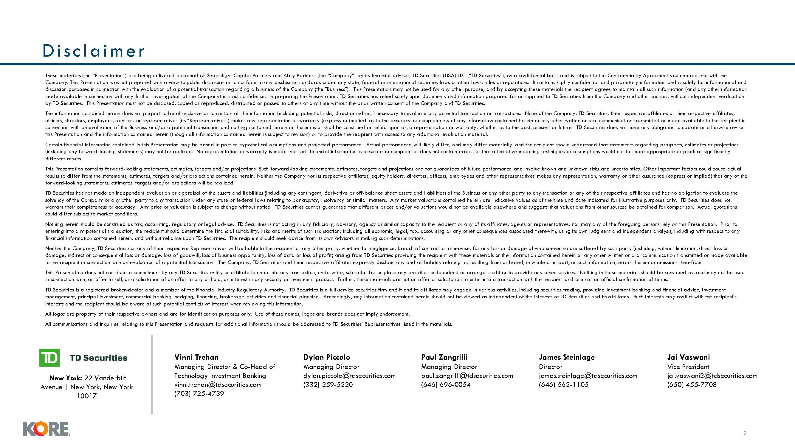 materials or the information contained herein or any other written or oral communication transmitted or made available to the recipient in connection with an evaluation of a potential transaction. The Company, TD Securities and their respective